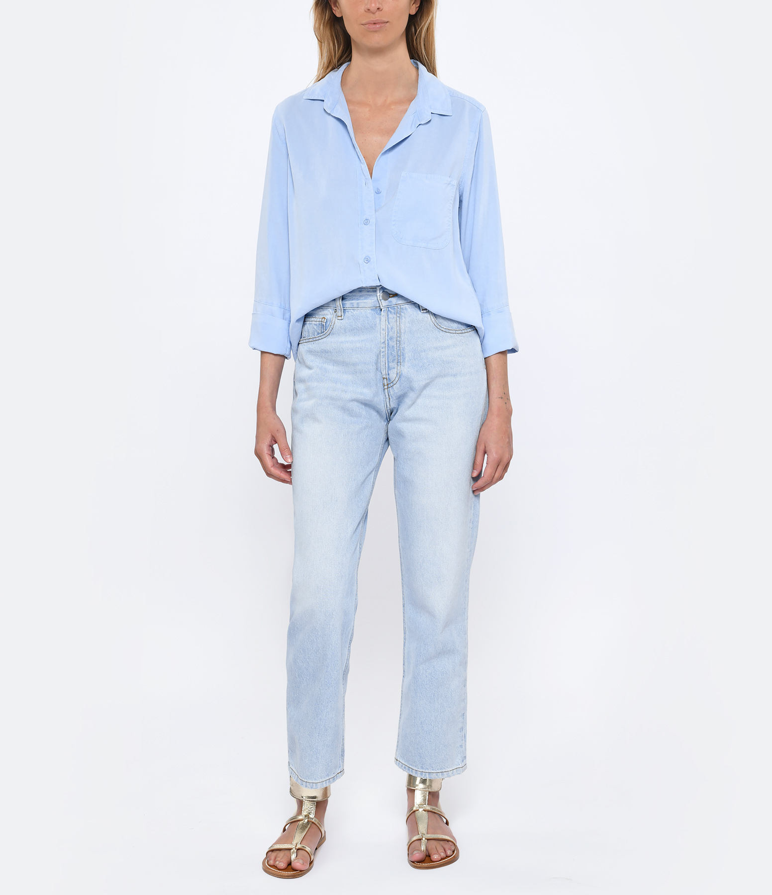Chemise bleue. Une poche plaquée poitrine. Col pointu. Manches longues. Fermeture boutonnée sur le devant. Coupe droite. Base droite.