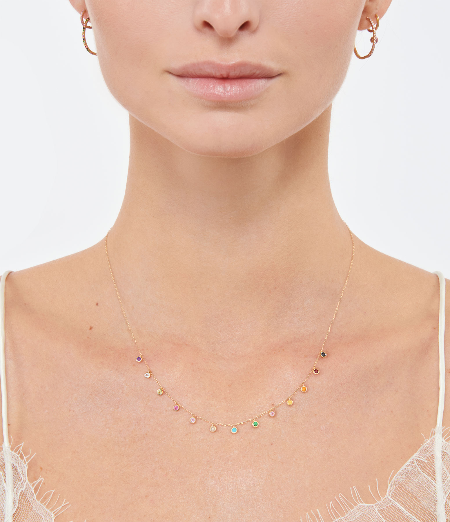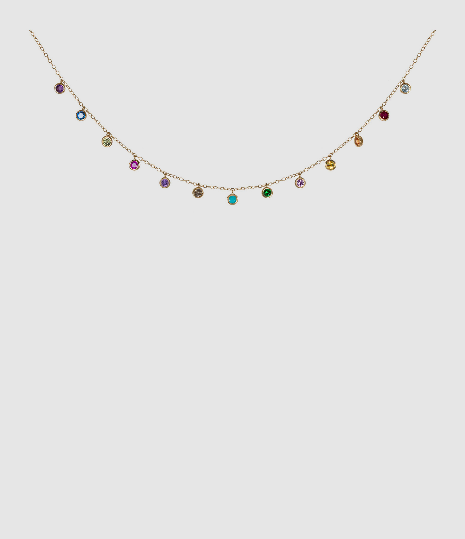 Collier court en or jaune avec 13 pierres serti clos : diamant, turquoise, saphir rose clair, saphir rose fuchsia, saphir bleu, aquamarine, péridot, tsavorite, ruby, améthyste, saphir orange, citrine, diamant brun.