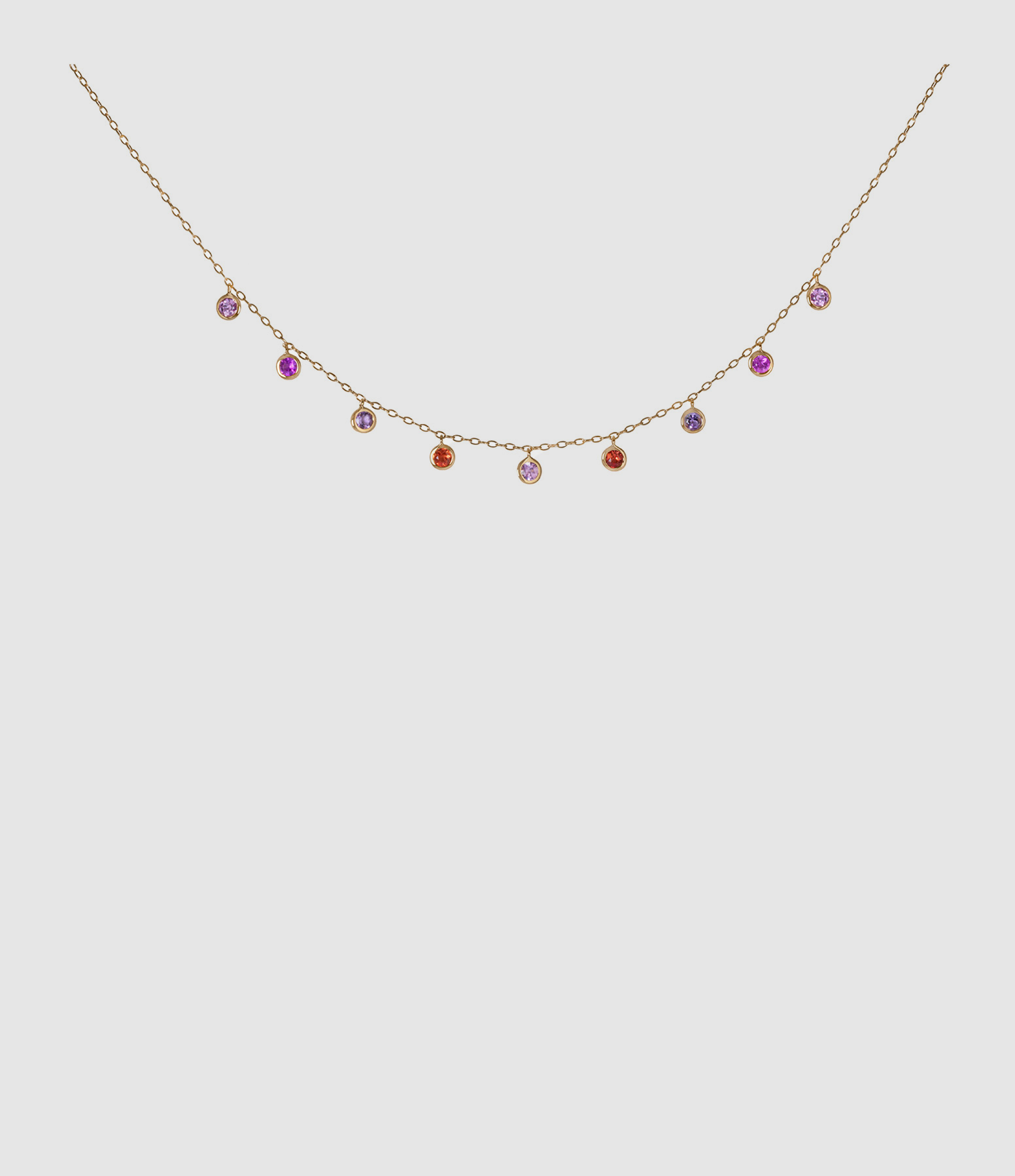 Collier court en or jaune avec 9 pierres serti clos saphir rose clair, saphir orange, améthyste et saphir rose fuchsia.