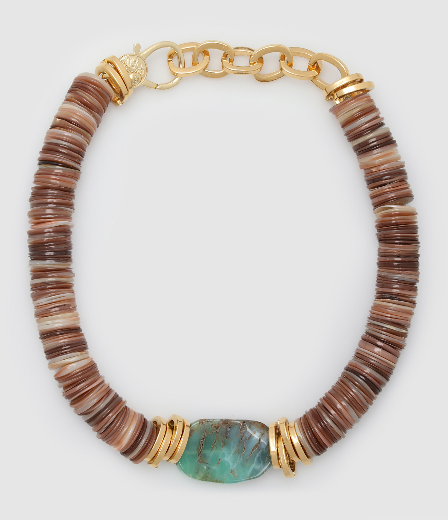 Collier en coquillages marron avec anneaux dorés et pierre turquoise au centre. Fermoir à ressort avec chaine de réglage.