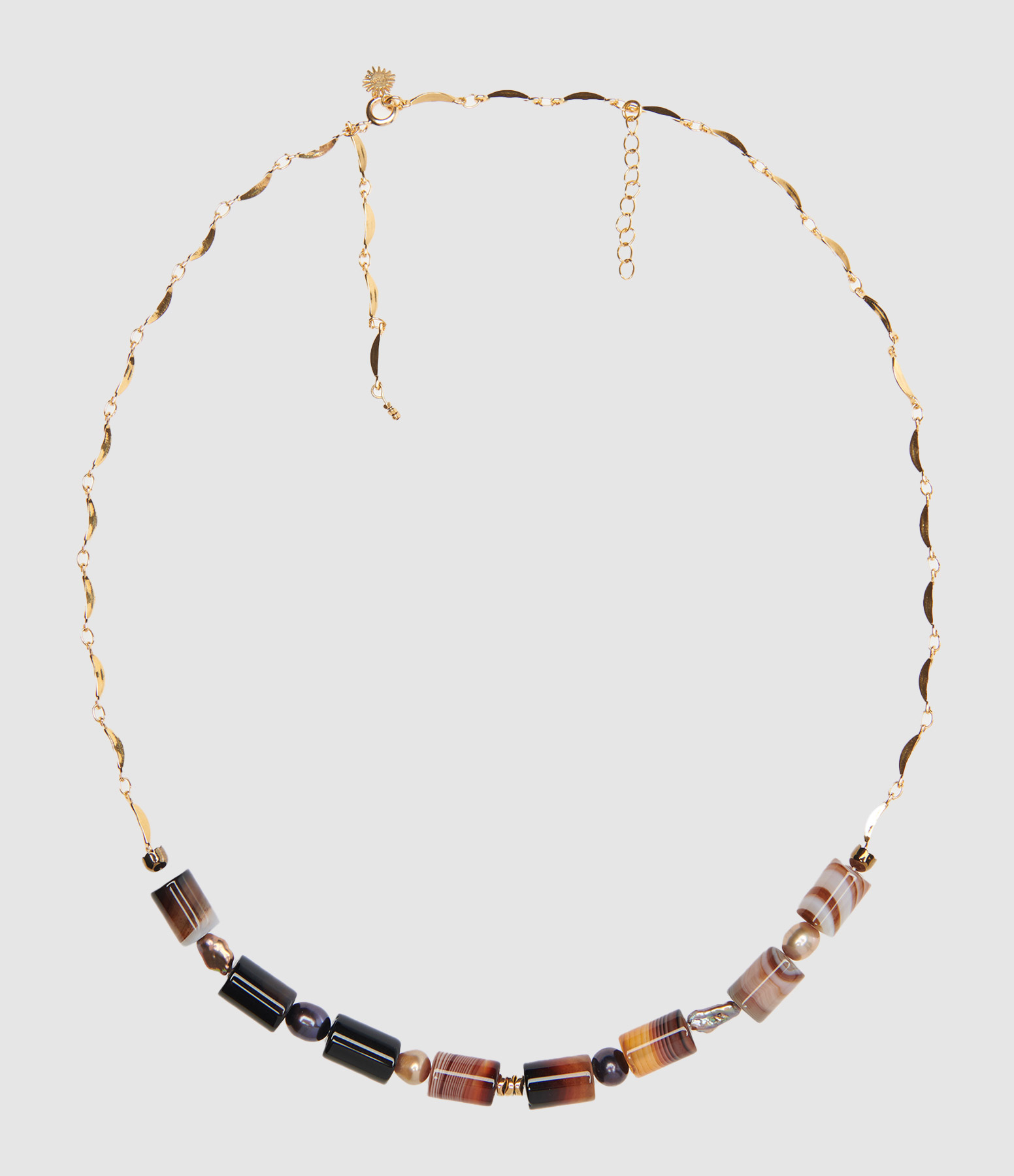 Collier en perles avec détails dorés. Fermoir à ressort avec chainette de réglage.