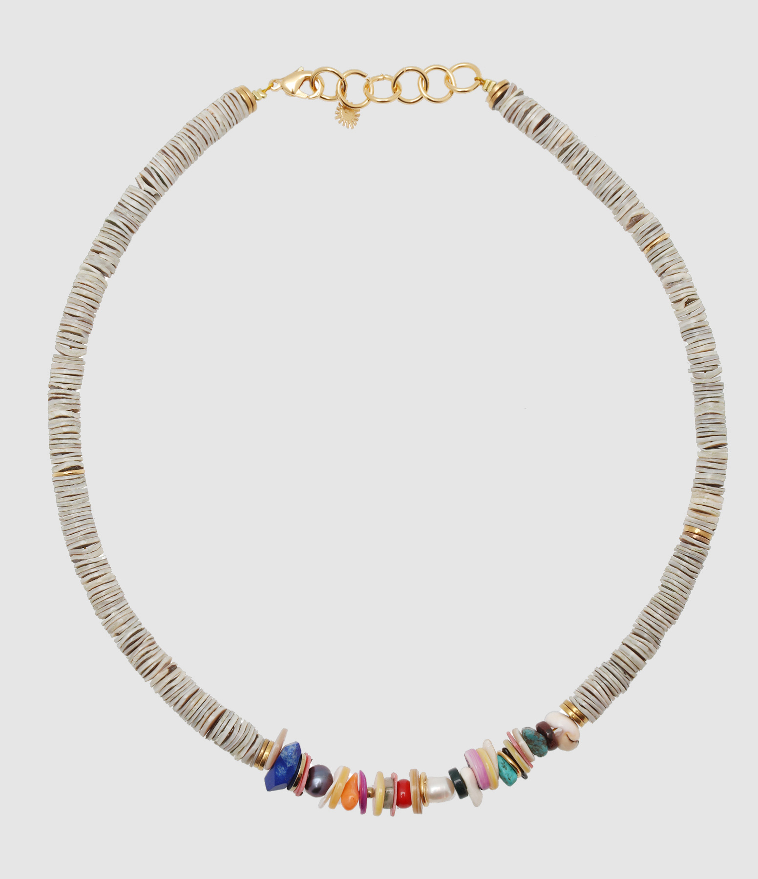 Collier en coquillages gris avec anneaux dorés et perles multicolores au centre. Fermoir à ressort avec chainette de réglage.