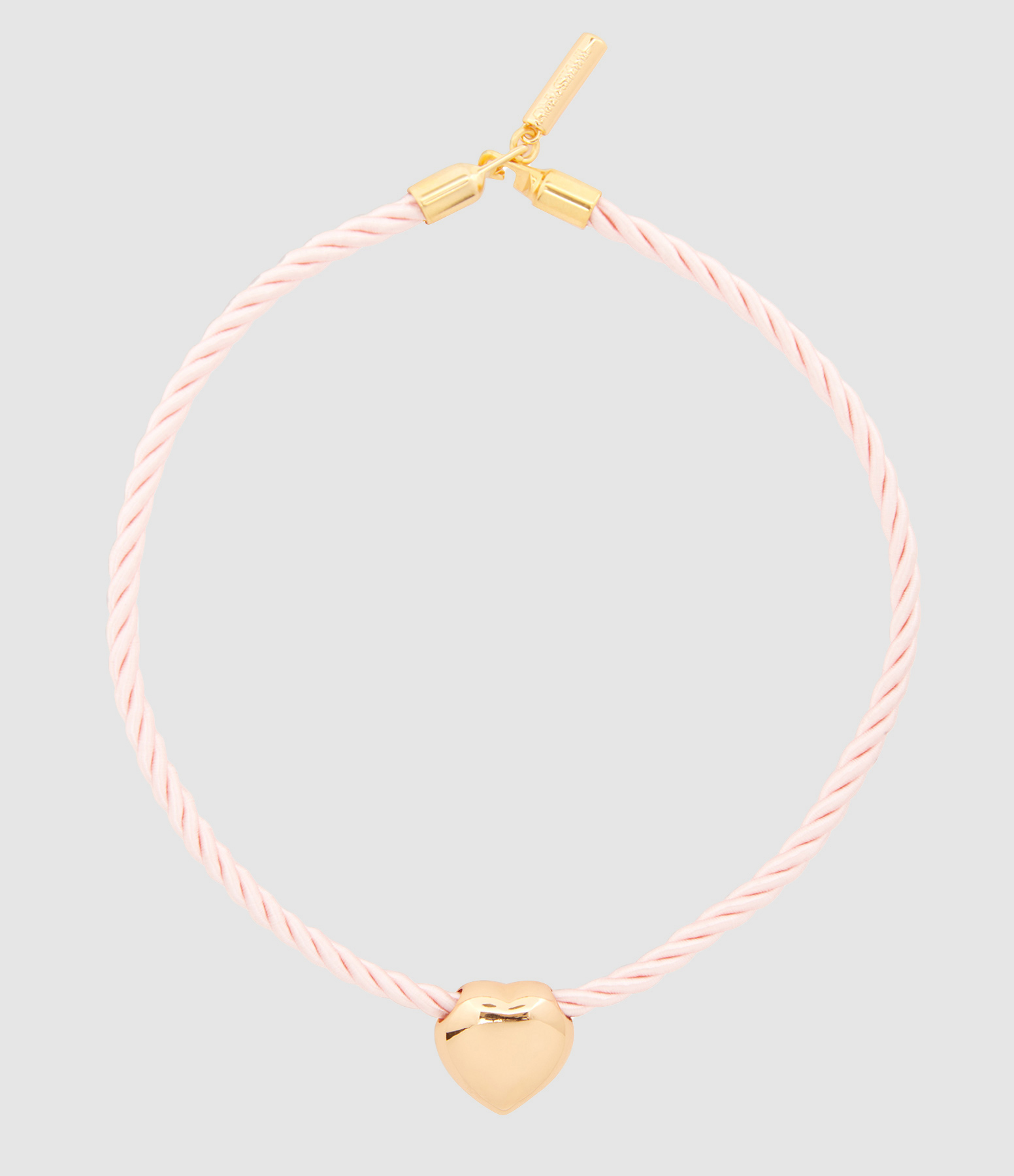 Collier sur cordon en satin rose avec un cœur doré. Fermoir à crochet.