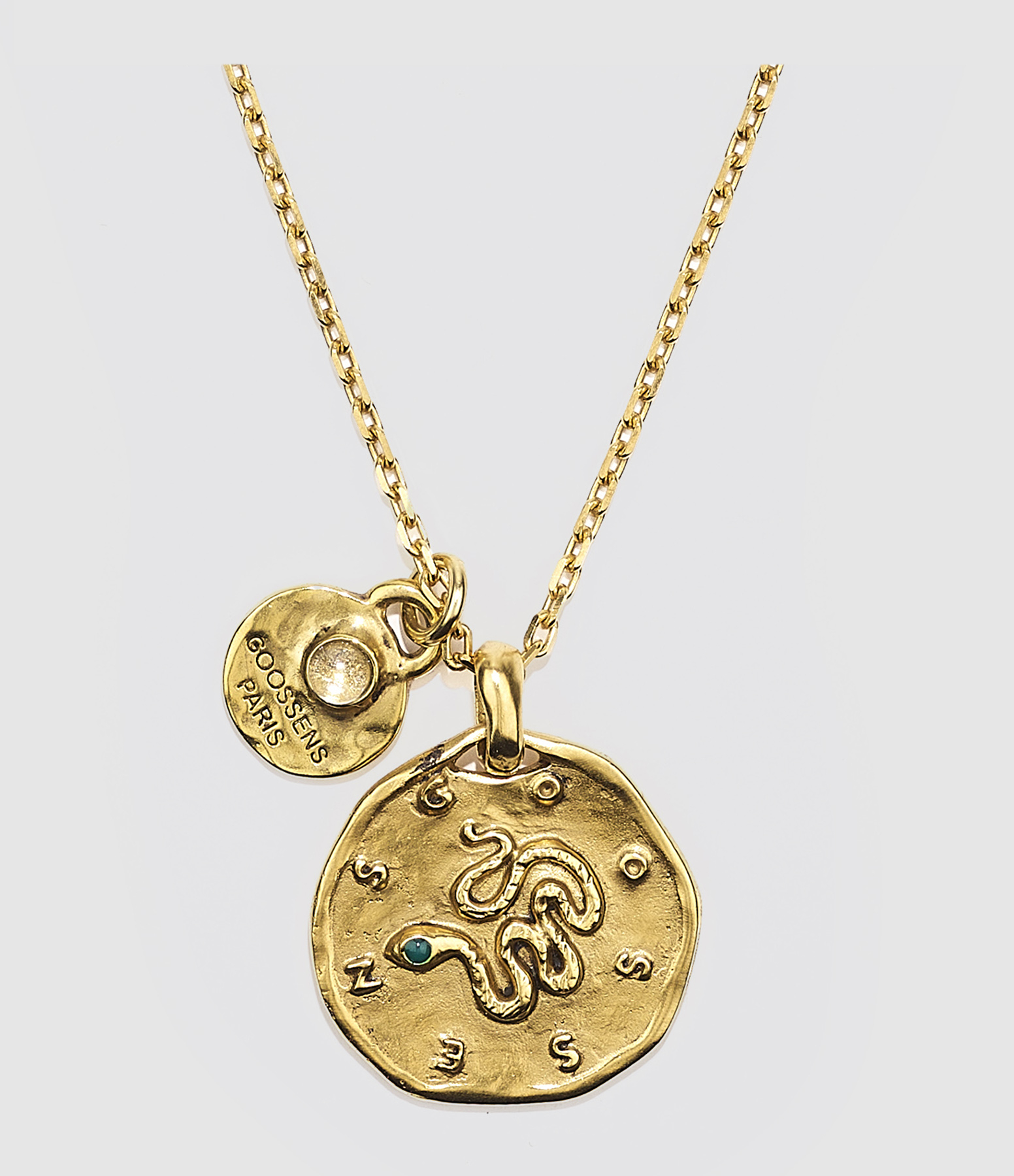 Collier sur chaîne en métal trempé dans un bain d'or 24 carats. Médaille serpent et inscriptions "GOOSENS". Fermoir classique à ressort.
