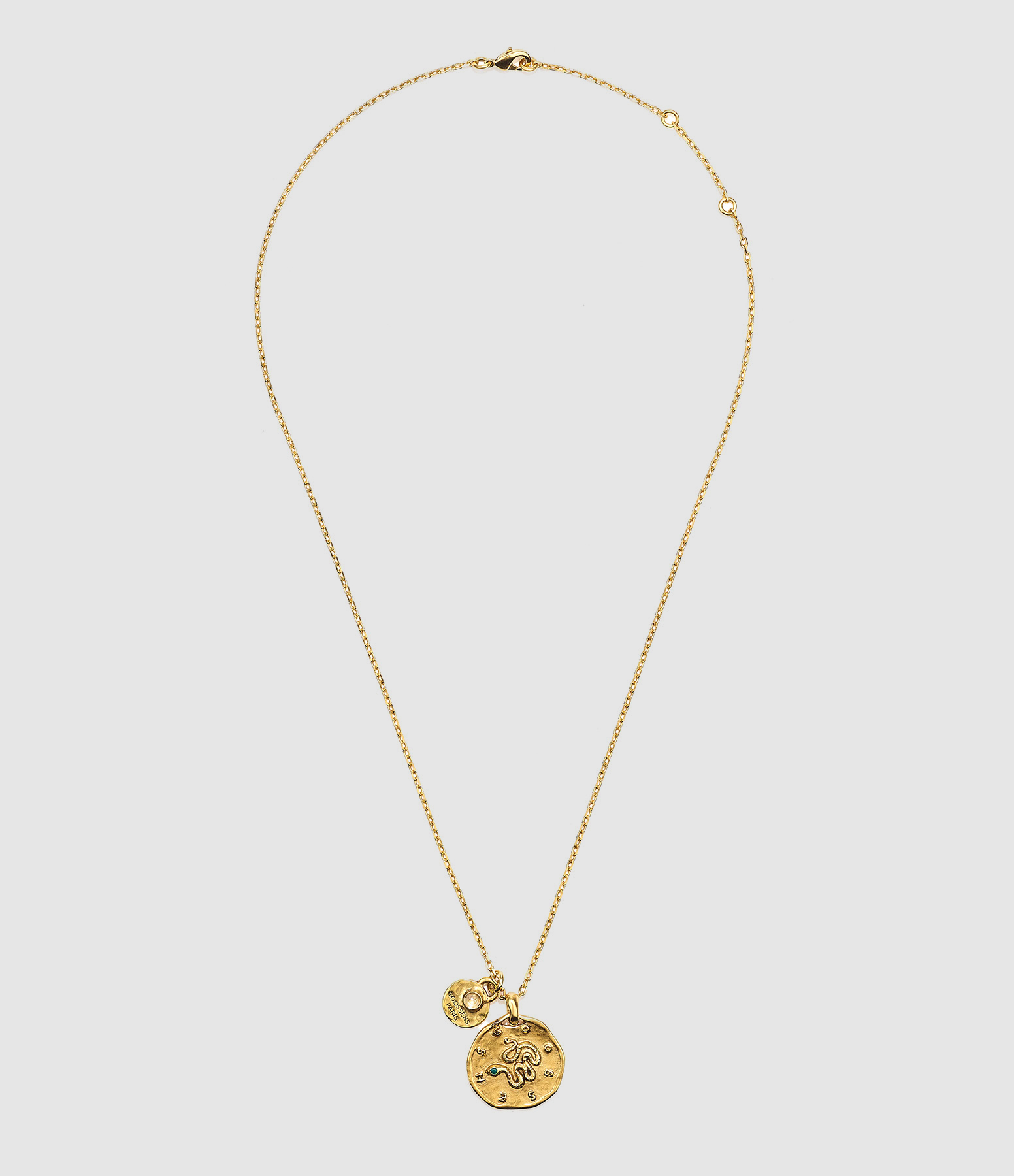 Collier sur chaîne en métal trempé dans un bain d'or 24 carats. Médaille serpent et inscriptions "GOOSENS". Fermoir classique à ressort.