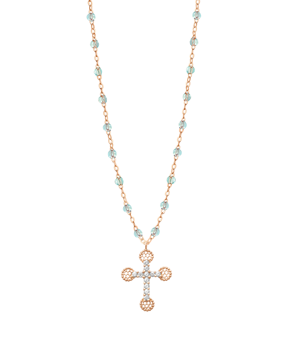 Collier sur chaîne en or gris, jaune ou rose agrémenté d'un pendentif Croix Dentelle serti de 11 diamants blancs et de perles de résine. Fermoir classique à ressort avec contre-anneau.