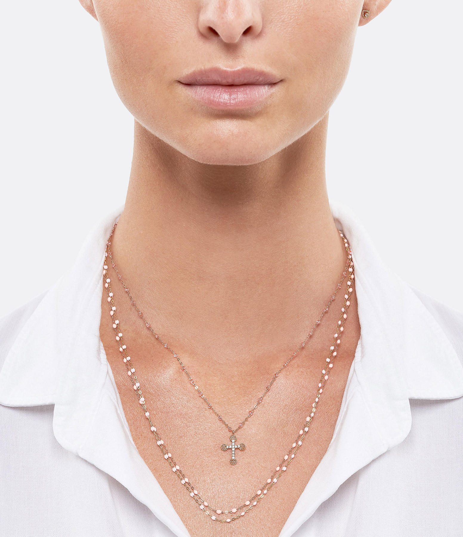 Collier sur chaîne en or gris, jaune ou rose avec une croix et pierres de résine. Fermoir classique à ressort avec contre-anneau.