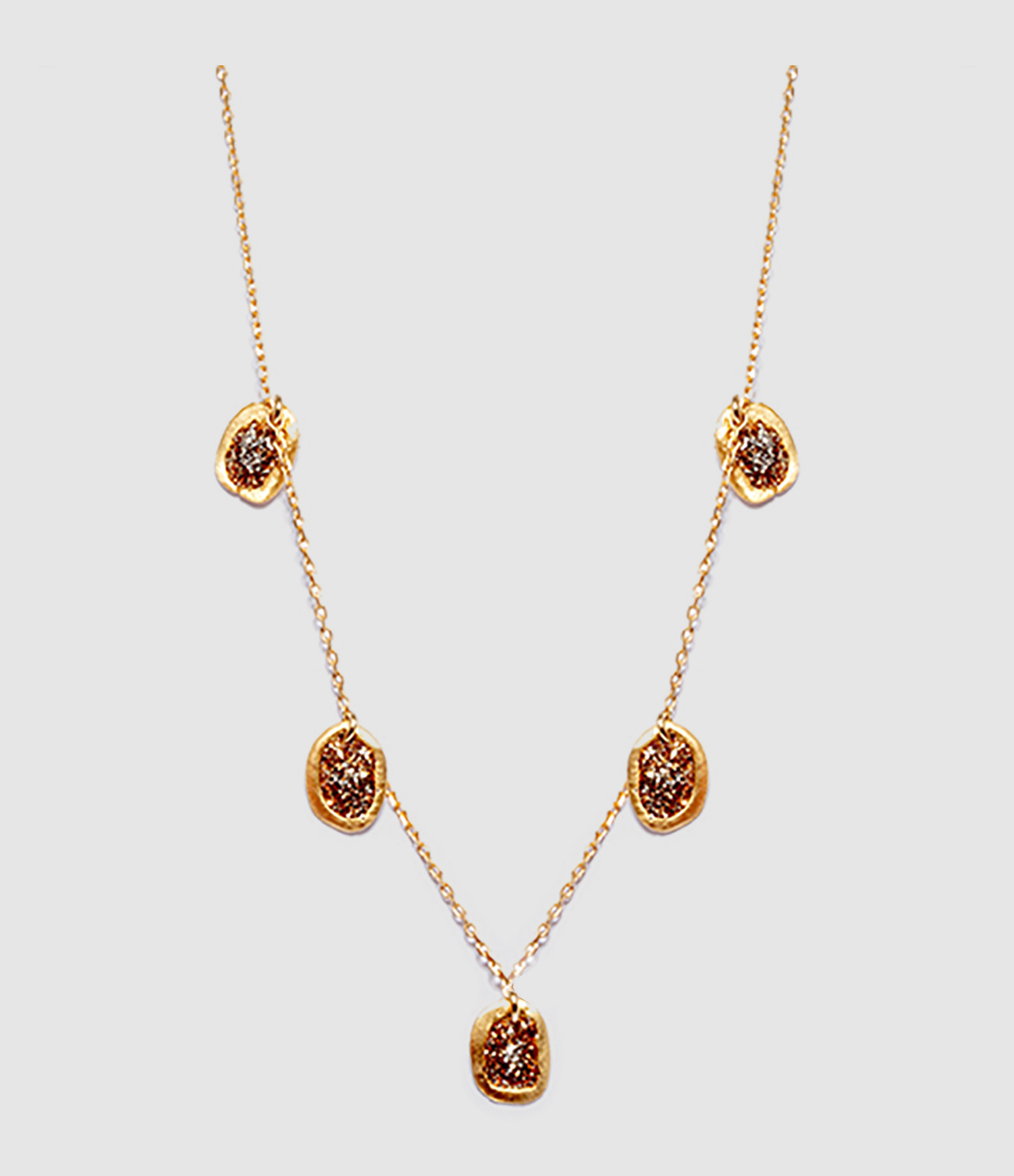 Collier sur chaîne en argent doré à l'or fin, avec cinq pendentifs en argent doré et émail pailleté. Fermoir à ressort.