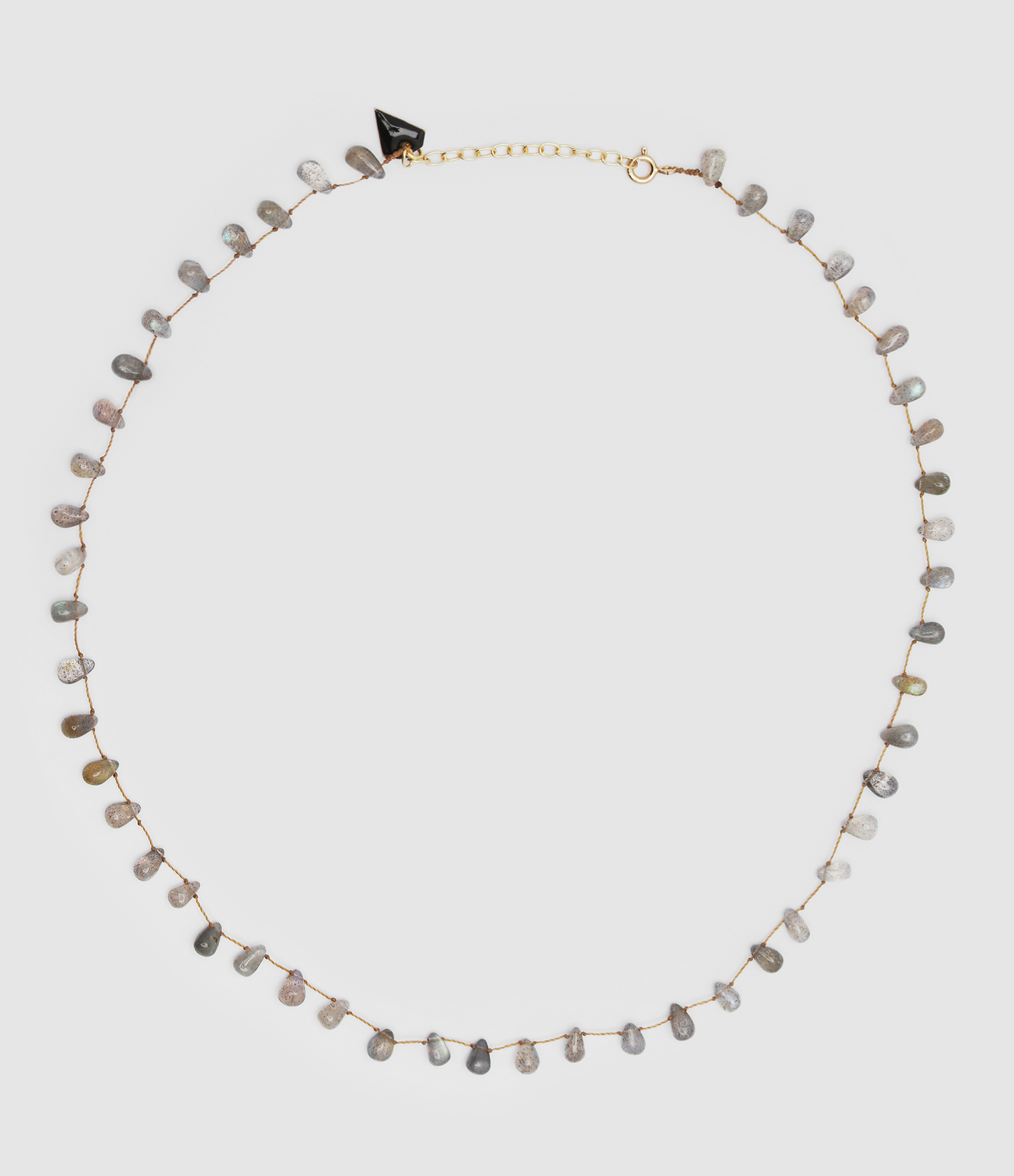 Collier cordon orné de perles de labradorite taillées en forme de goutte. Fermoir et chainette de réglage dorés.