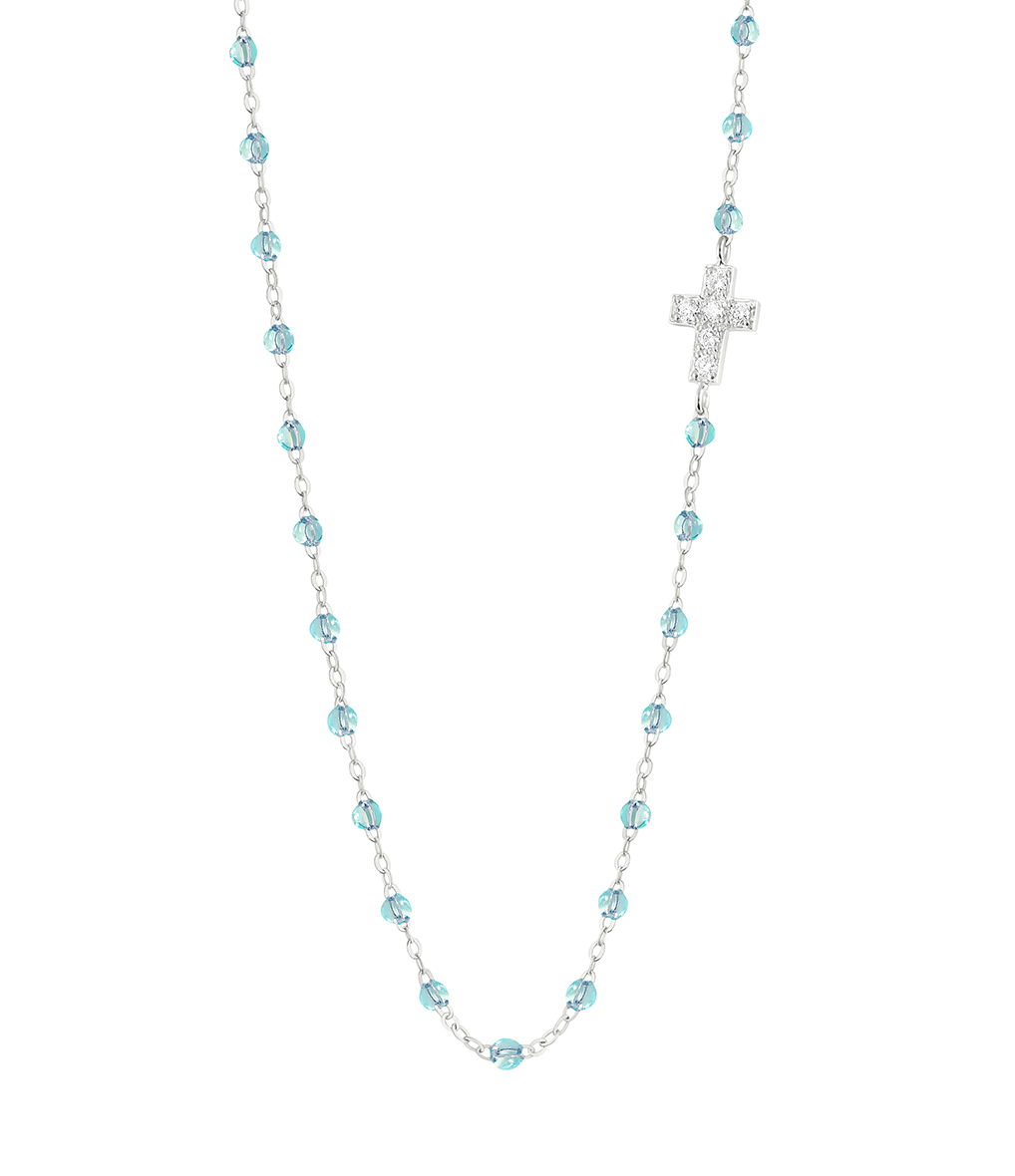 Collier sur chaîne en or gris, jaune ou rose agrémenté d'une Croix sertie de six diamants blancs et de perles de résine. Fermoir classique à ressort avec contre-anneau.