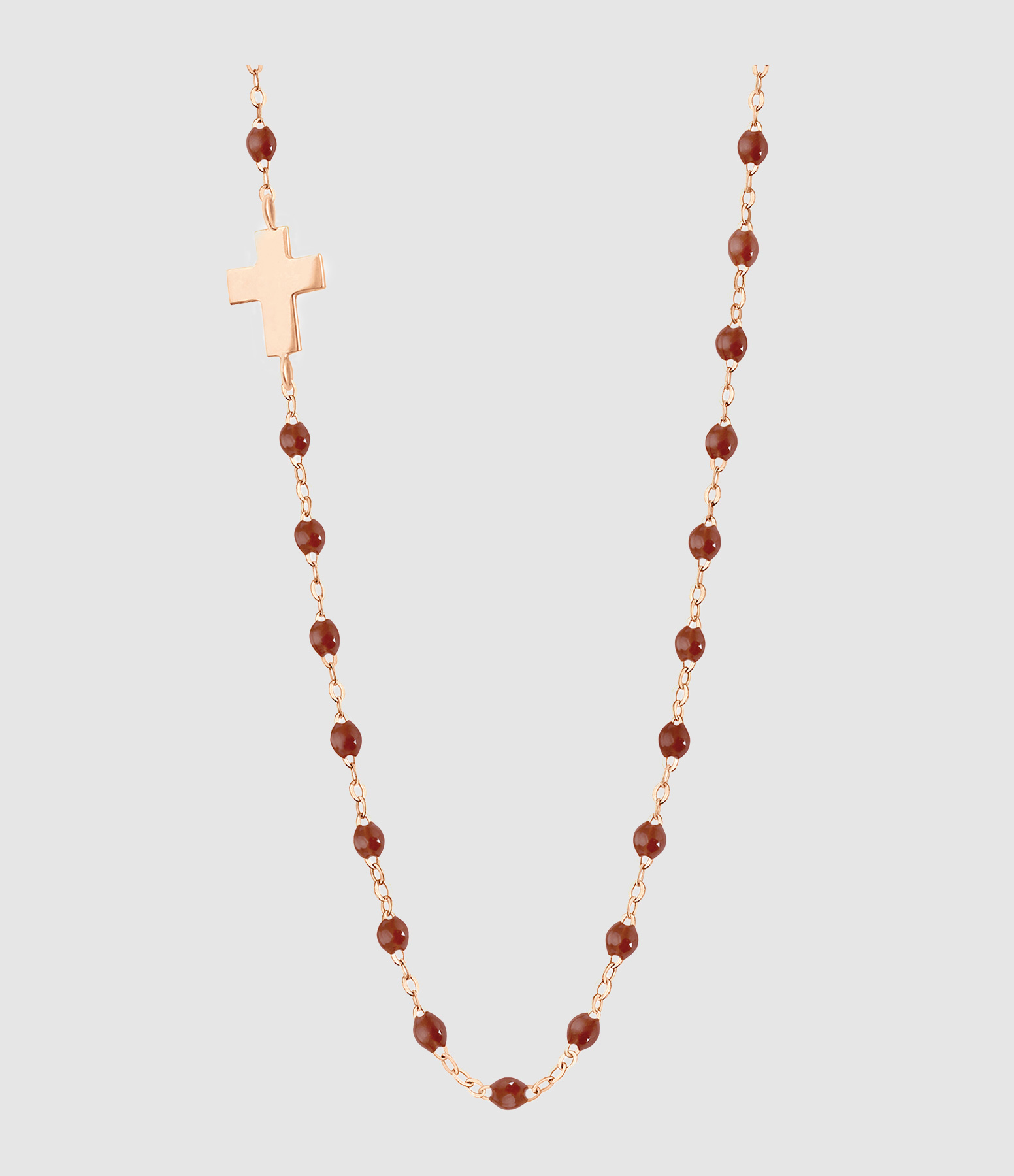 Collier sur chaîne en or agrémenté d'un pendentif Croix intégré à la chaîne et de perles de résine. Fermoir classique à ressort avec contre-anneau.