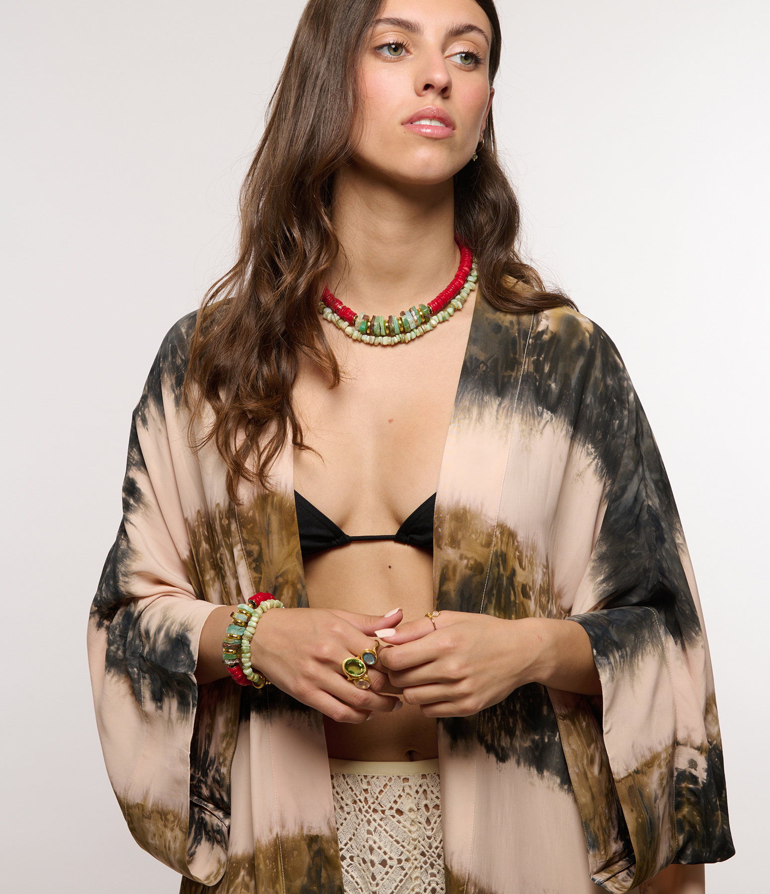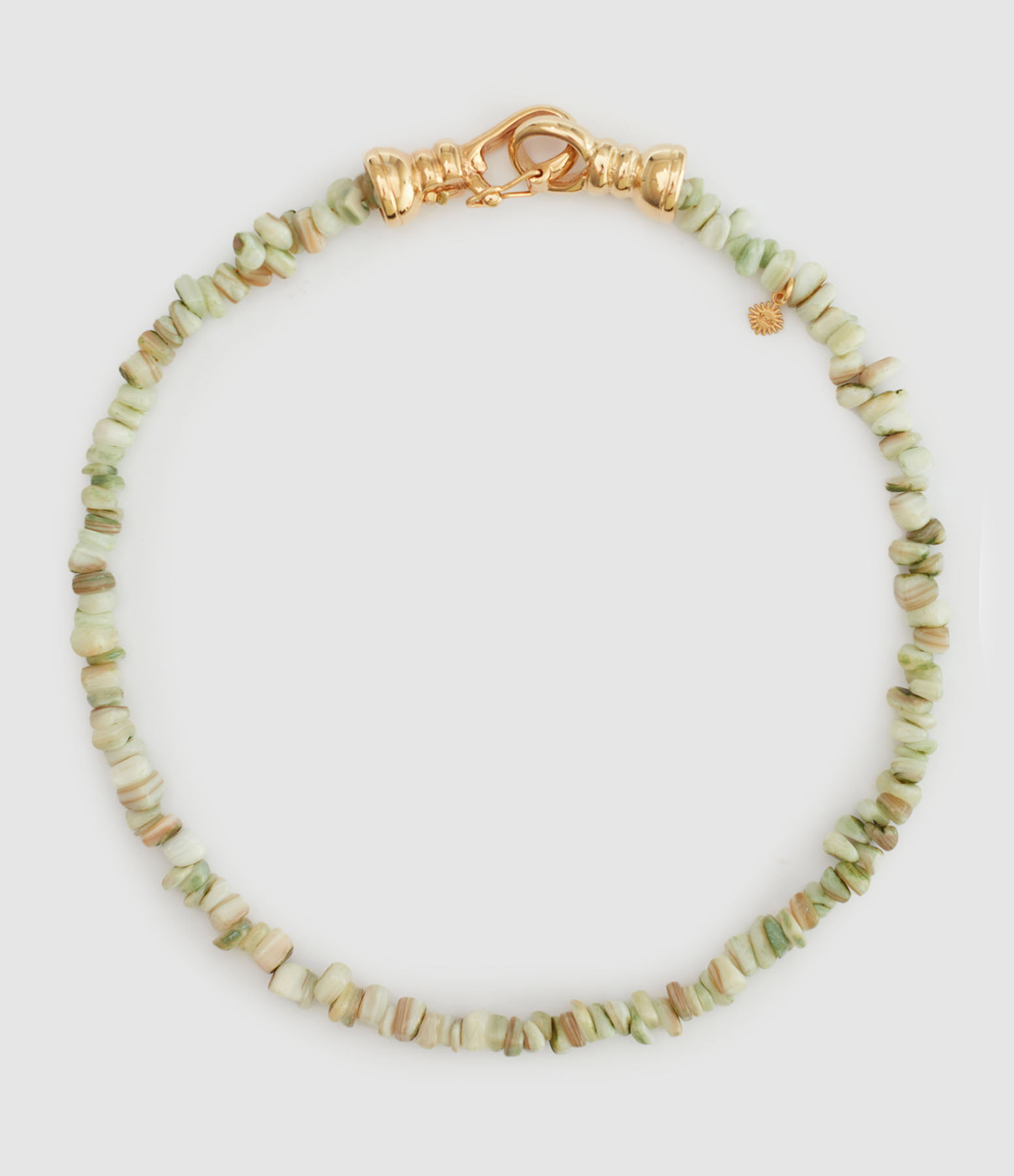 Collier en perles verts d'eaux. Pendentif soleil. Fermoir en plaqué or.