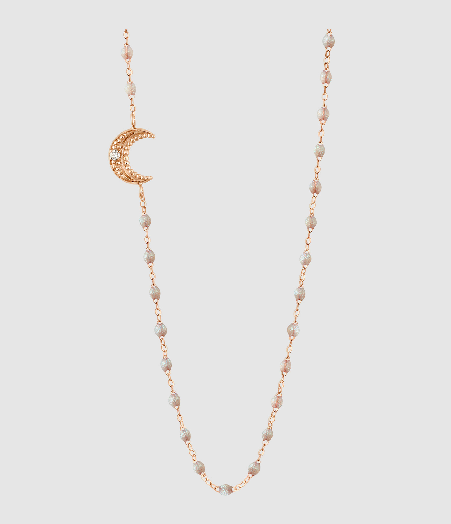 Collier en or rose agrémenté de perles de résine. Fermoir classique à ressort avec contre-anneau. Pendentif lune serti d'un diamant.