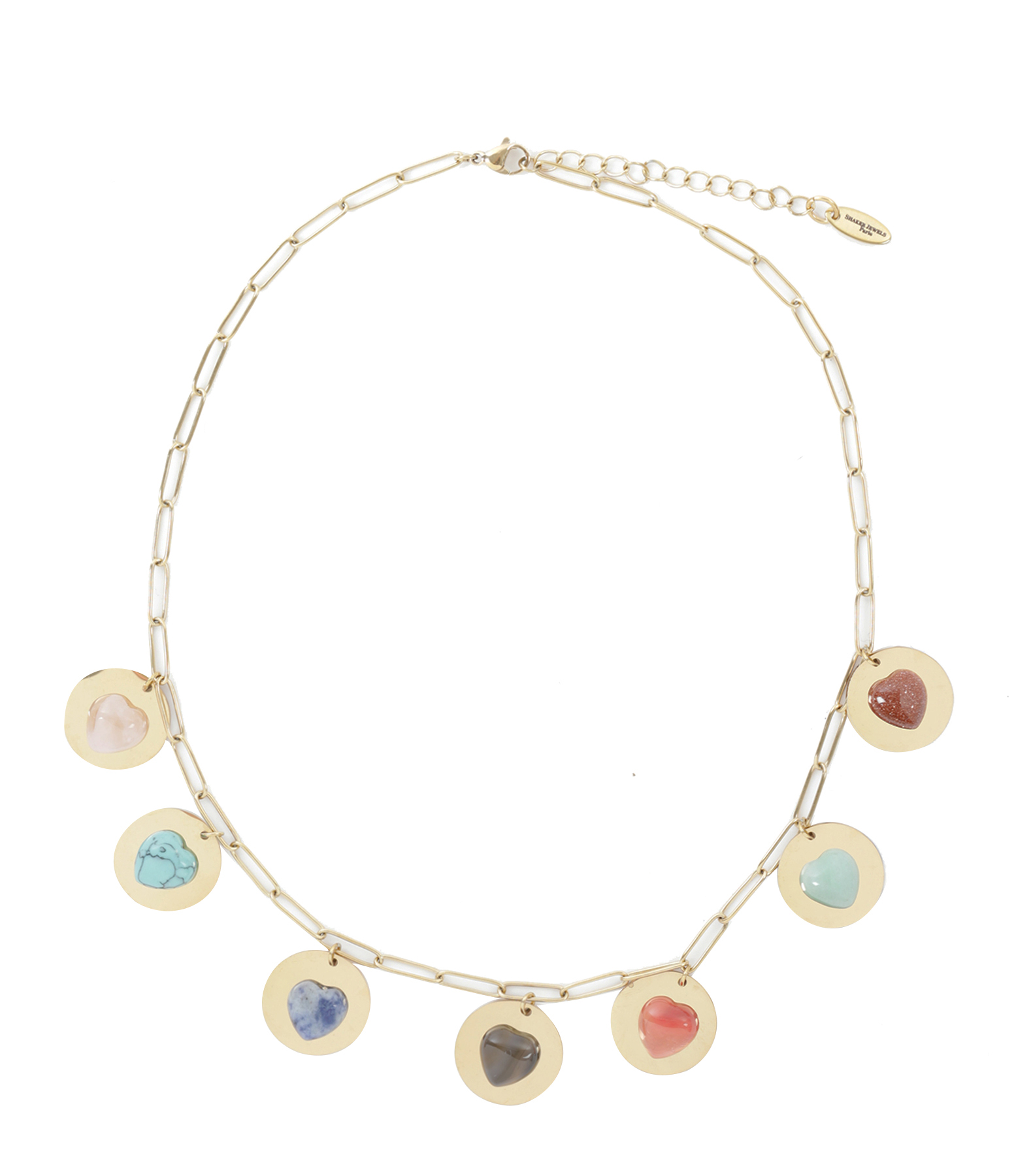Collier en argent doré, chaîne à large maille orné de sept pampilles rondes chaque ornée d'une pierre taillée en cœur. Fermoir classique à ressort.