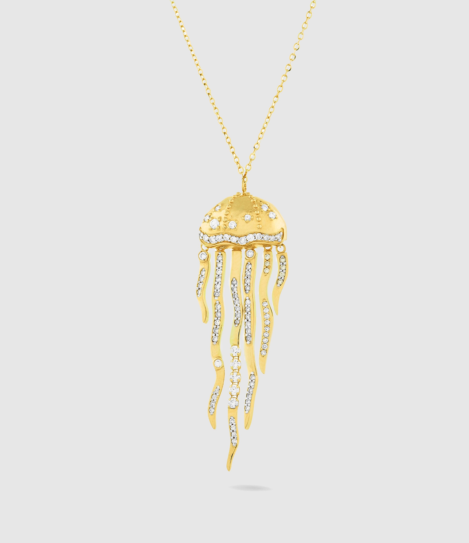 Collier en or jaune avec pendentif en forme de méduse serti de diamants. Fermoir à ressort rond.