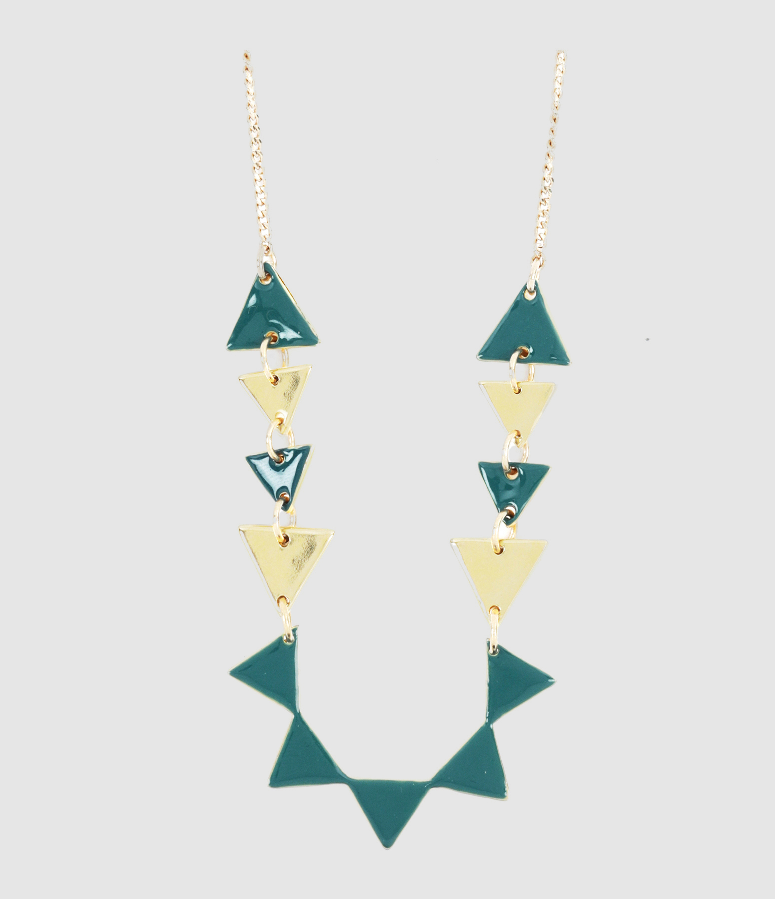 Collier chaîne en laiton doré avec triangles en résine verte. Fermoir à ressort.