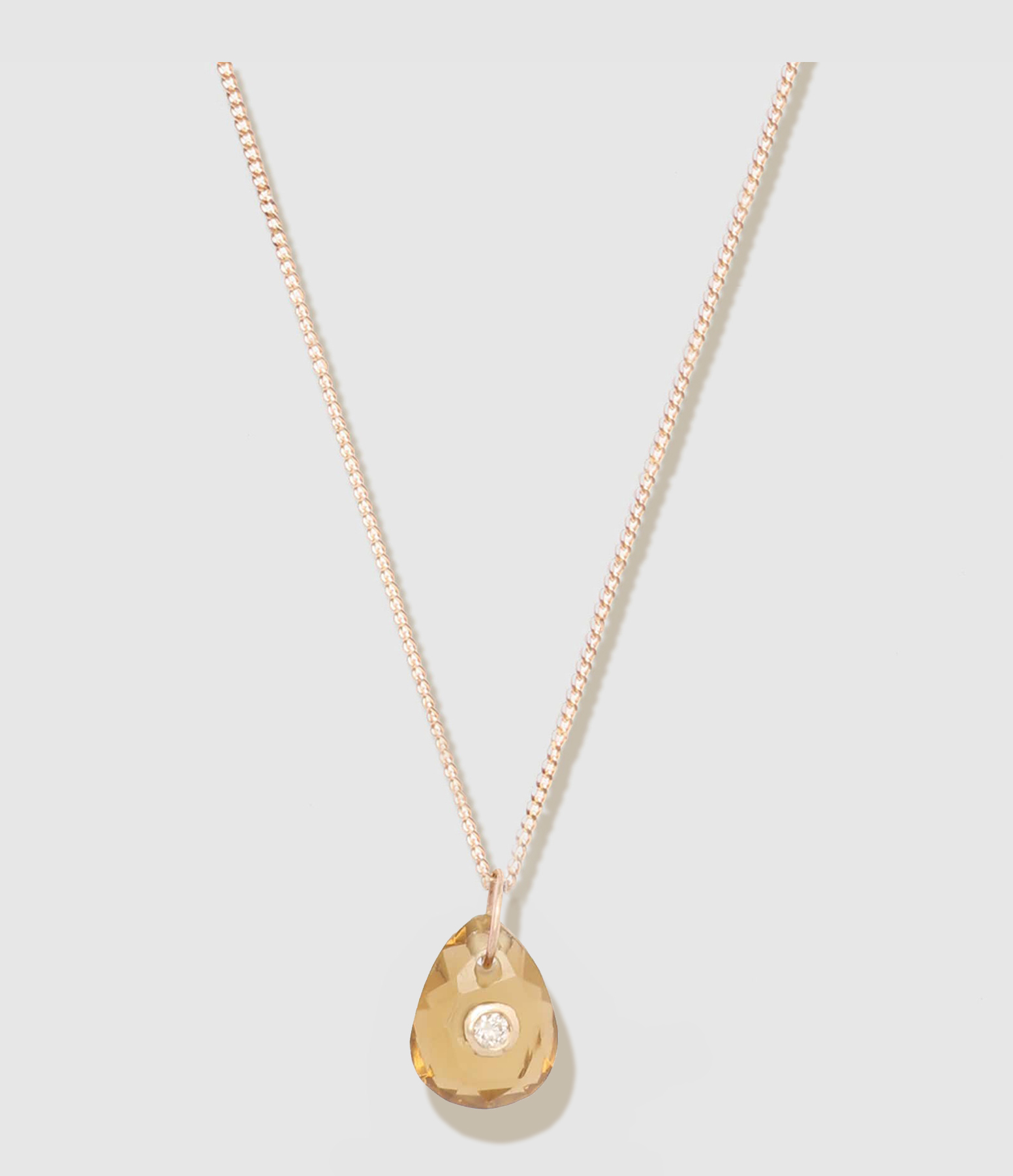Collier en or jaune 9 carat sur fine chaine gourmette 14 carat. Le pendentif est une petite goutte en quartz miel facettée au centre de laquelle est serti un diamant blanc de 1,5 mm de diamètre.