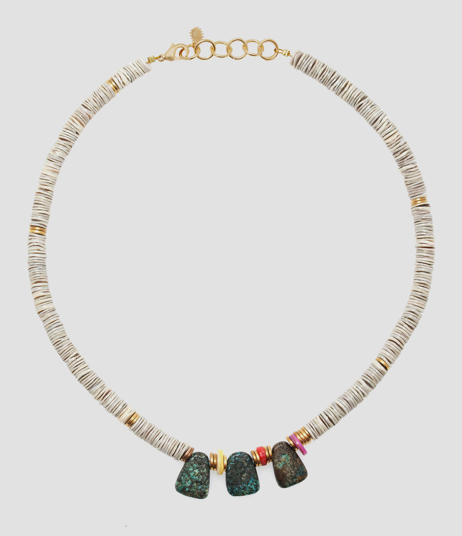 Collier en coquillages gris avec anneaux dorés et perles multicolores au centre. Fermoir à ressort avec chainette de réglage.