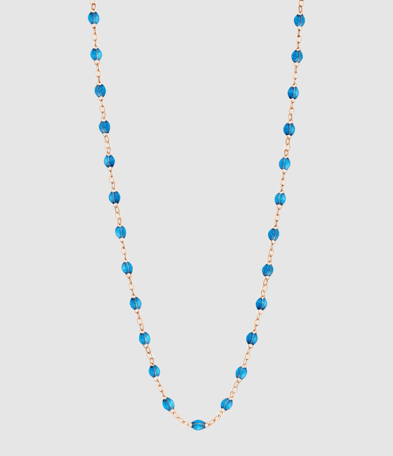 Collier sur chaîne en or gris, jaune ou rose agrémenté de perles de résine. Fermoir classique à ressort avec contre-anneau.