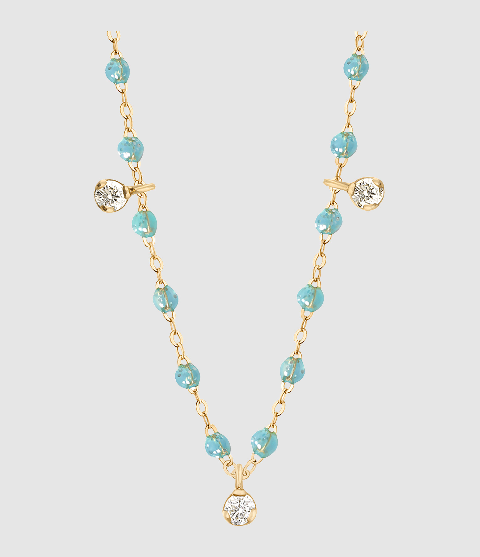 Collier sur chaîne en or jaune et mini perles de résine, agrémenté de trois pendentifs en diamants. Fermoir classique à ressort avec contre-anneau.