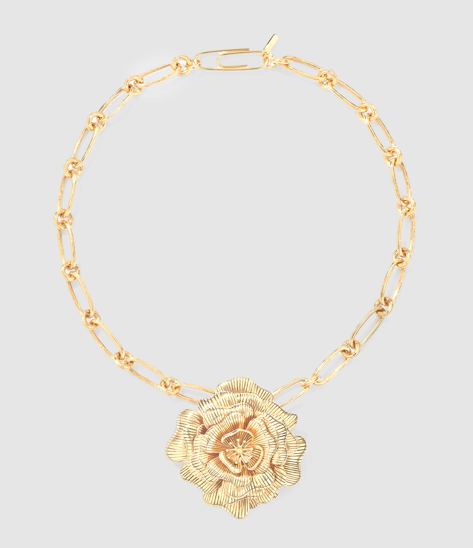 Collier doré en maille avec pendentif en forme de rose. Fermoir trombone iconique de la maison. Ce produit peut également se porter en broche.