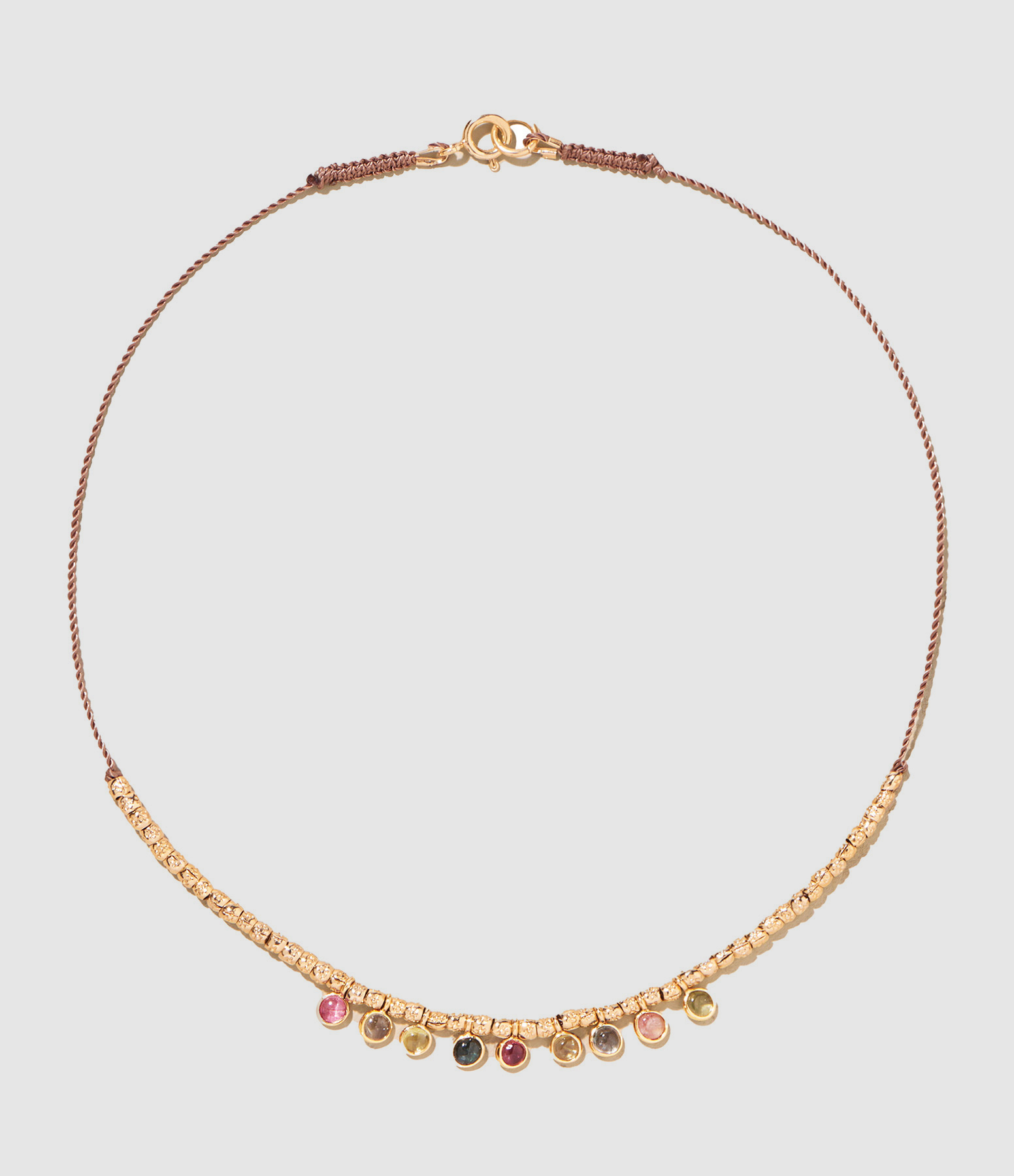 Collier sur cordon marron en argent doré et pierres fines de Tourmaline. Fermoir classique à ressort.