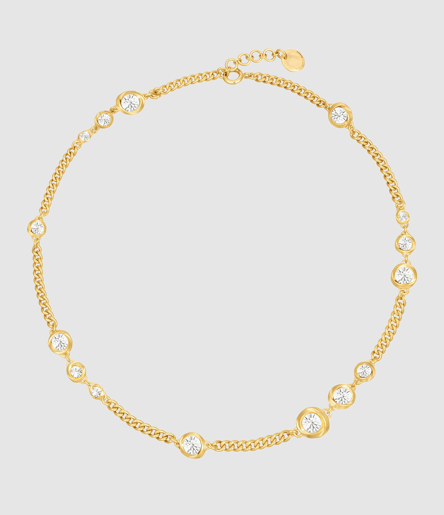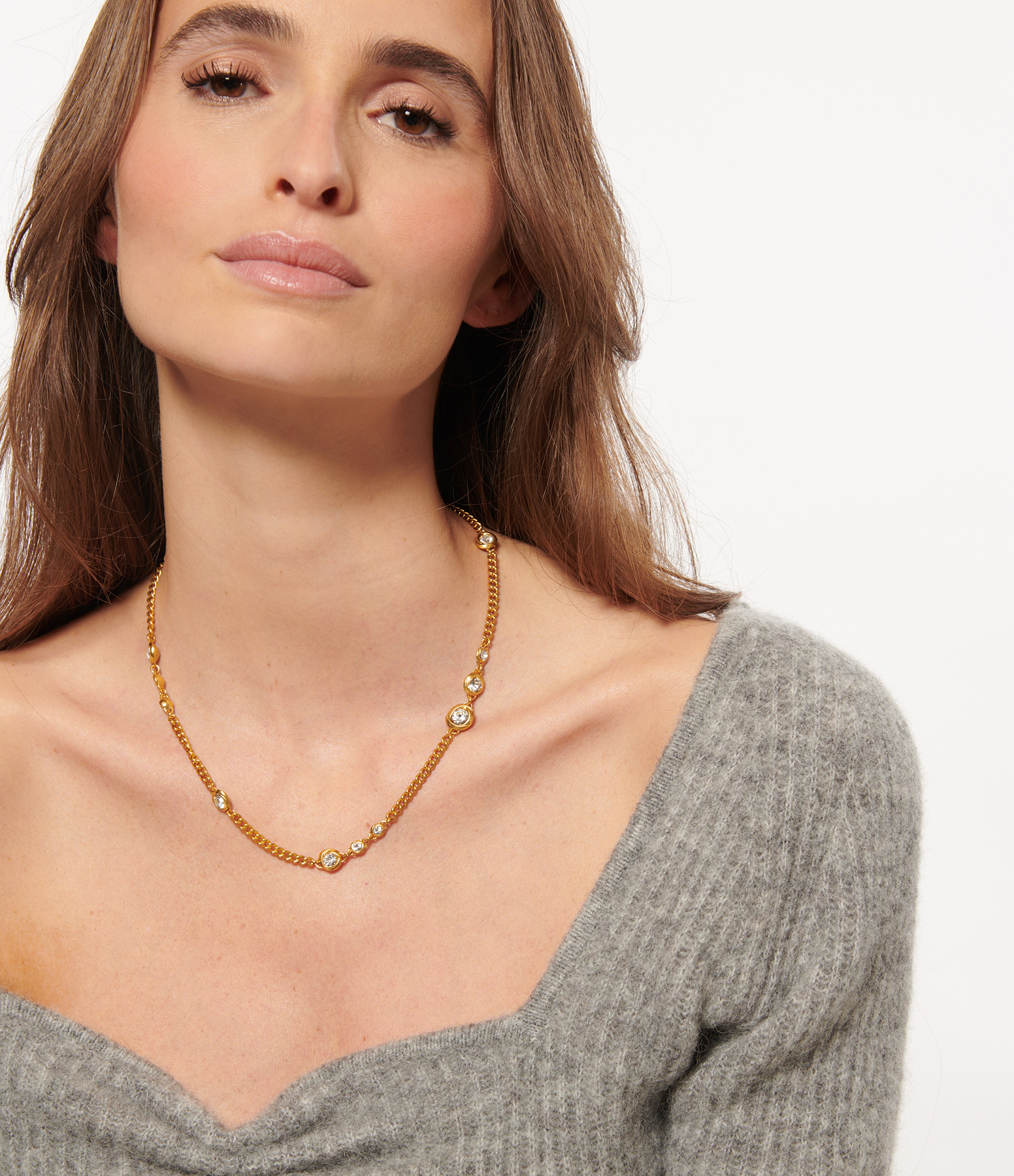 Collier composé d'une chaine en maille gourmette et de cristaux blancs. Fermoir à ressort.