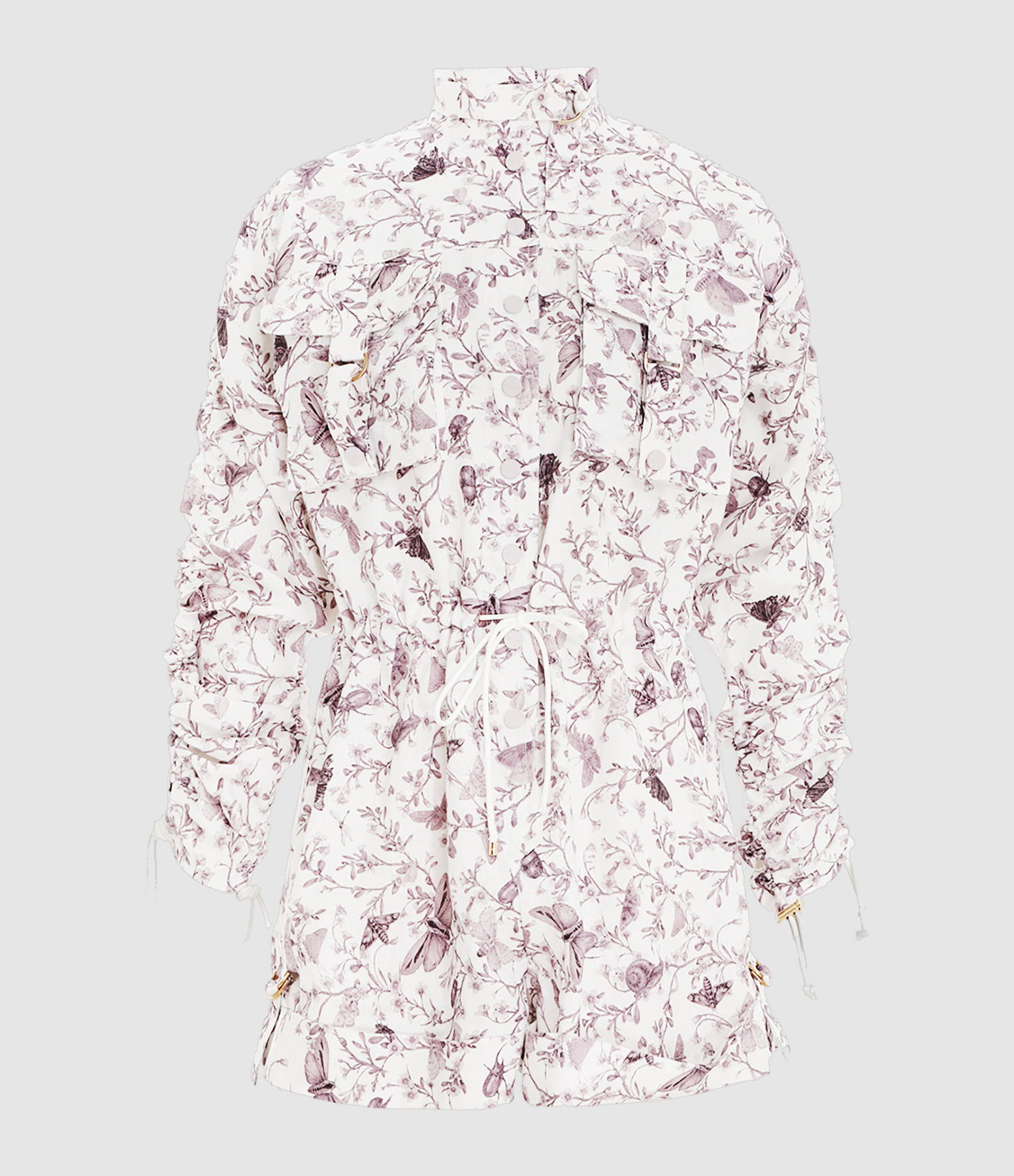 Combinaison short en lin blanc à imprimé fleuri violet. Col montant avec sangles. Manches longues avec serrage par cordons. Deux poches à rabats fermable par bouton pression et sangles. Deux poches fendues. Taille élastiquée. Ceinture en corde amovible. Coupe droite. Base droite avec ourlet et sangles. Non doublée.