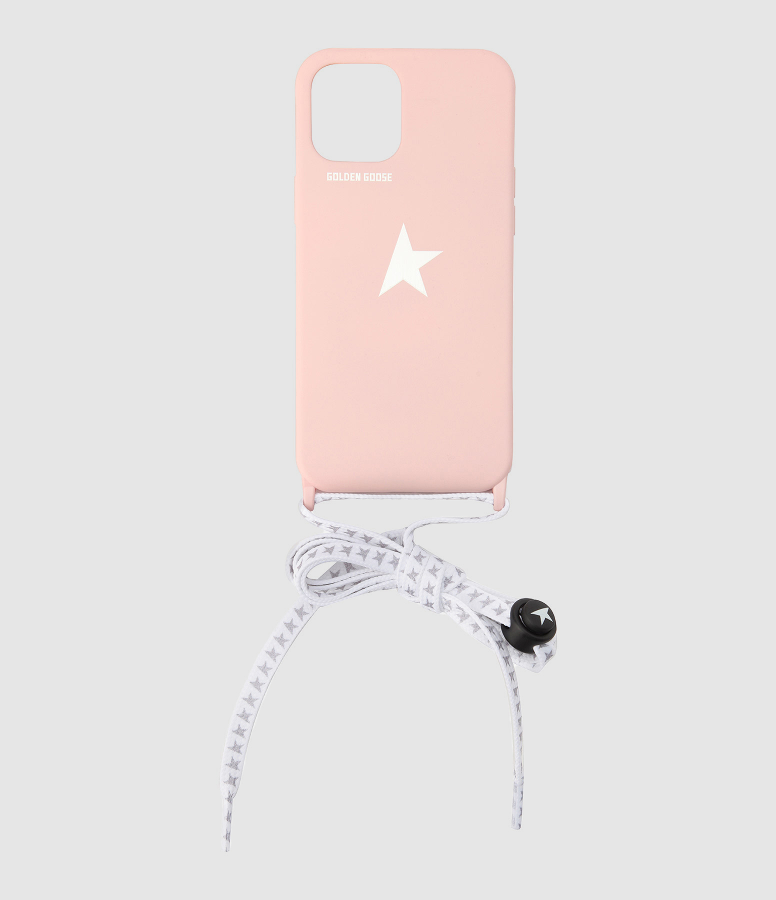 Coque de téléphone rose pour iPhone 12/12 pro max. Logo étoile et inscription "GOLDEN GOOSE" imprimés en blanc. Lacet bandoulière blanc avec logo étoile imprimé en gris.