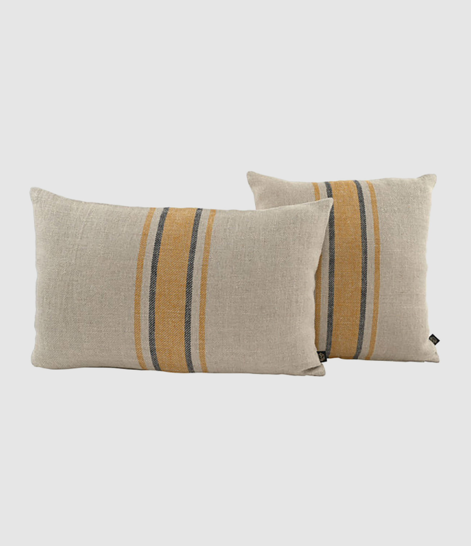 Housse de coussin en lin gris clair et rayures jaunes au centre.