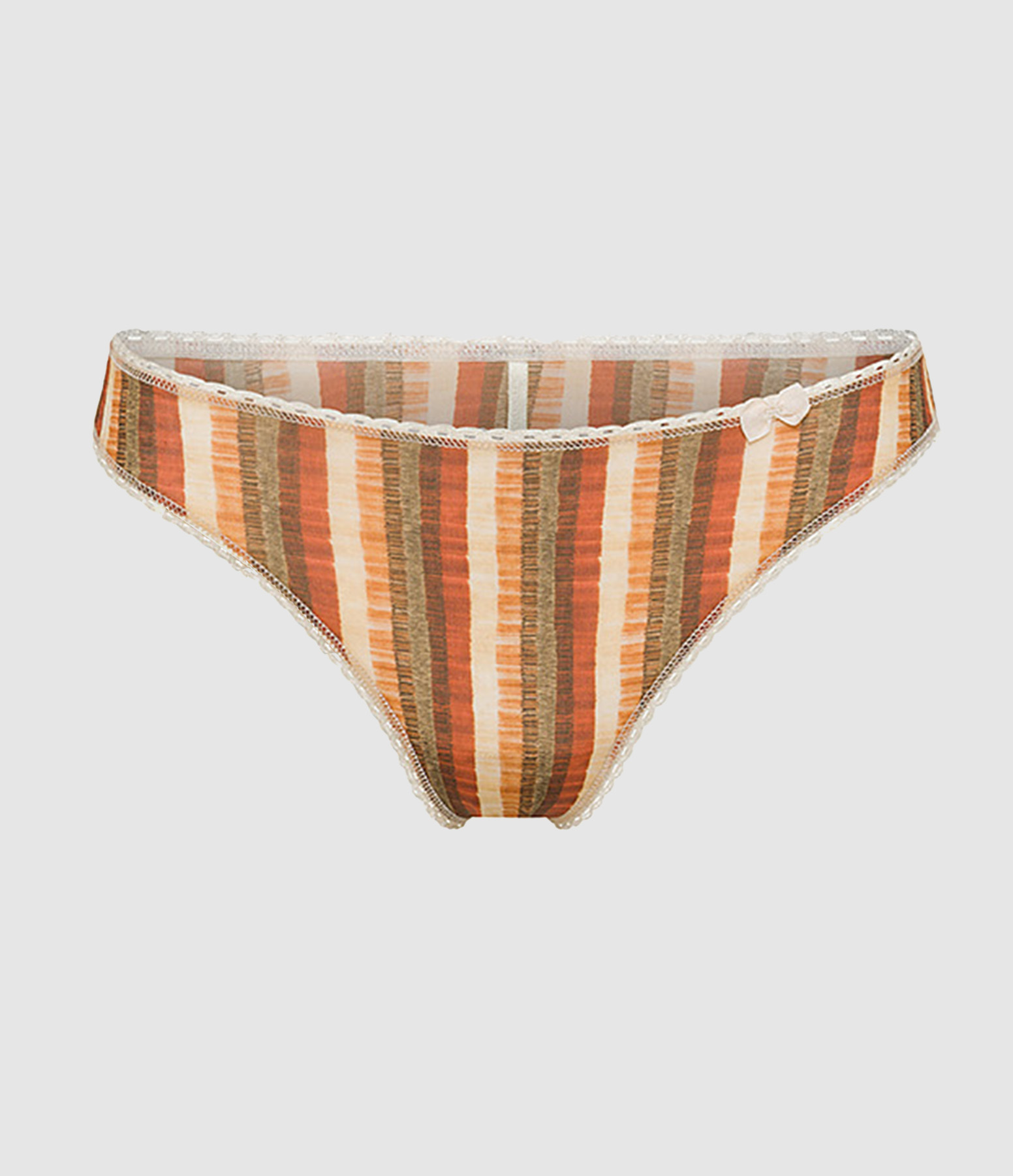 Culotte intemporelle modèle « brésilienne » en stretch doux, dans les imprimés exclusifs Momonì, orné de passementeries élastiques et d’un nœud dans une couleur contrastante.