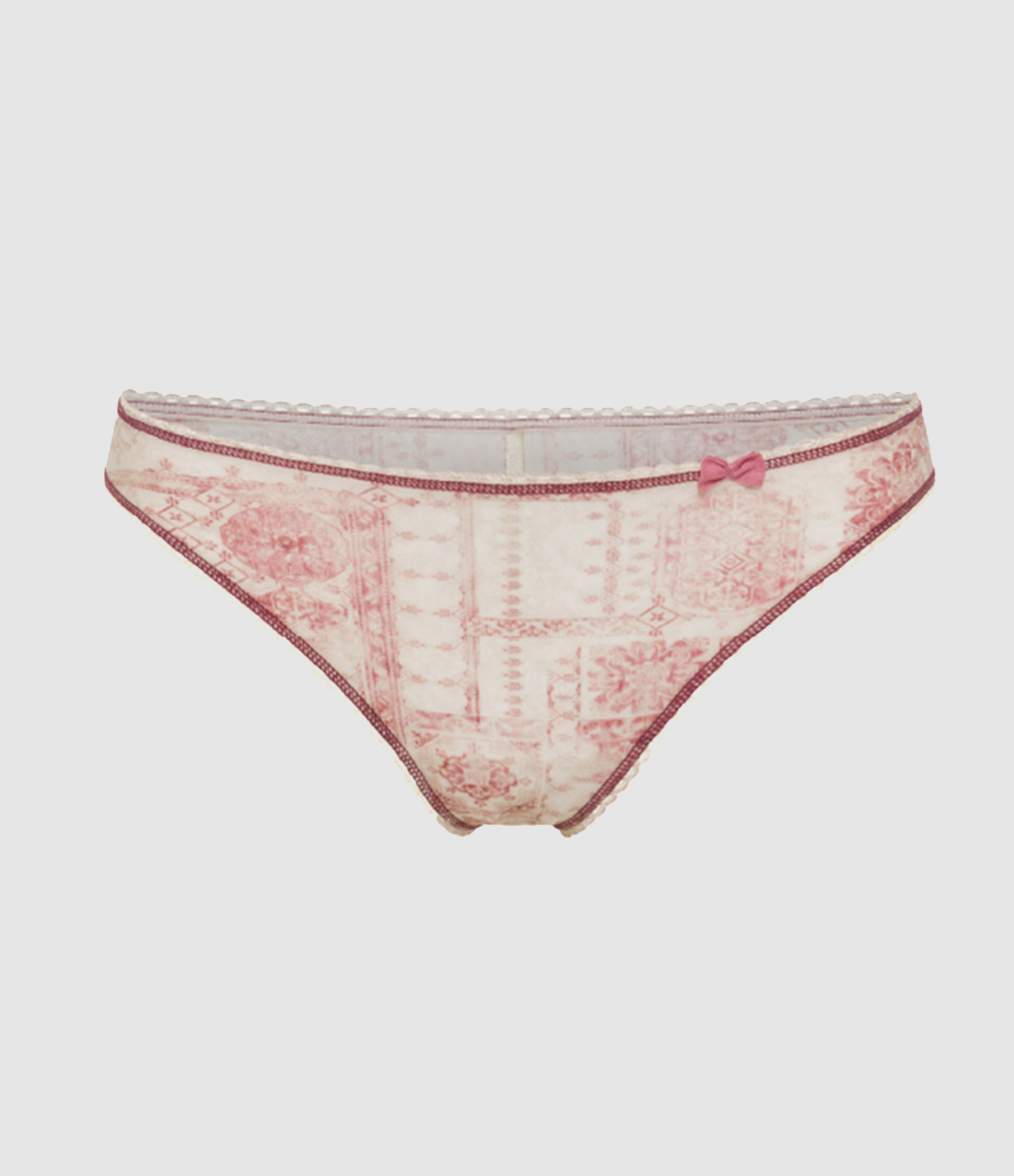 Culotte intemporelle modèle « brésilienne » en stretch doux, dans les imprimés exclusifs Momonì, orné de passementeries élastiques et d’un nœud dans une couleur contrastante