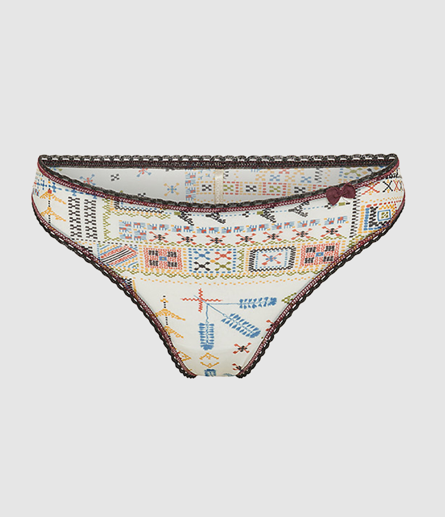 Culotte intemporelle modèle « brésilienne » en stretch doux, dans les imprimés exclusifs Momonì, orné de passementeries élastiques et d’un nœud dans une couleur contrastante.