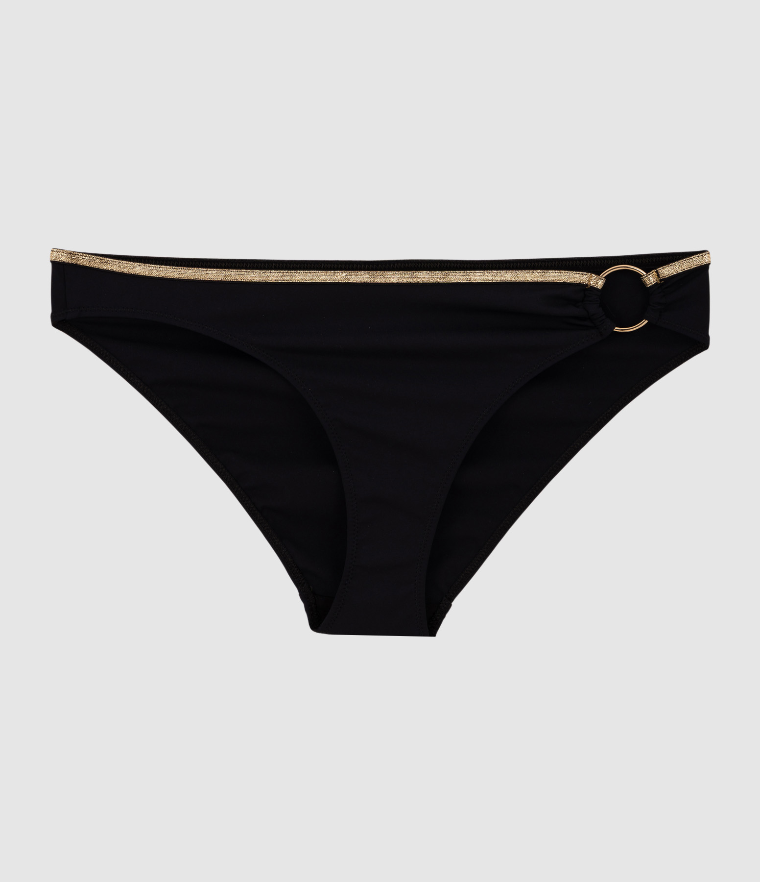 Bas de maillot de bain noir. Liséré en lurex doré. Détail anneau doré.