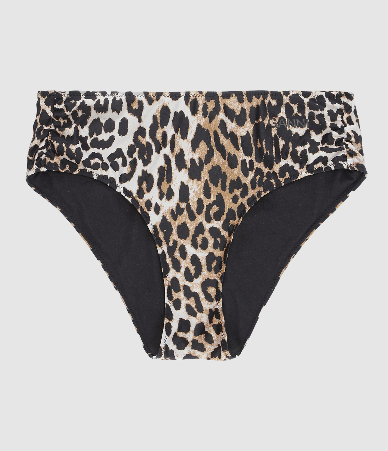 Culotte de bain à imprimé léopard. Taille haute avec fronces sur les côtés. Inscription noire "Ganni" floquée à l'avant. Entièrement élastiquée. Doublée.