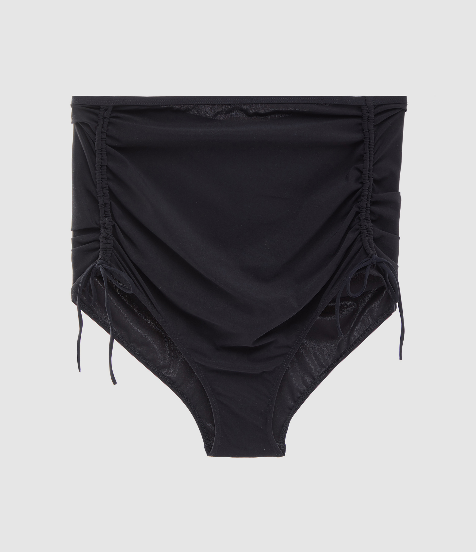 Culotte de maillot de bain noir. Coutures latérales élastiquées avec liens à nouer. Couture milieu dos froncée et élastiquée. Fond doublé.