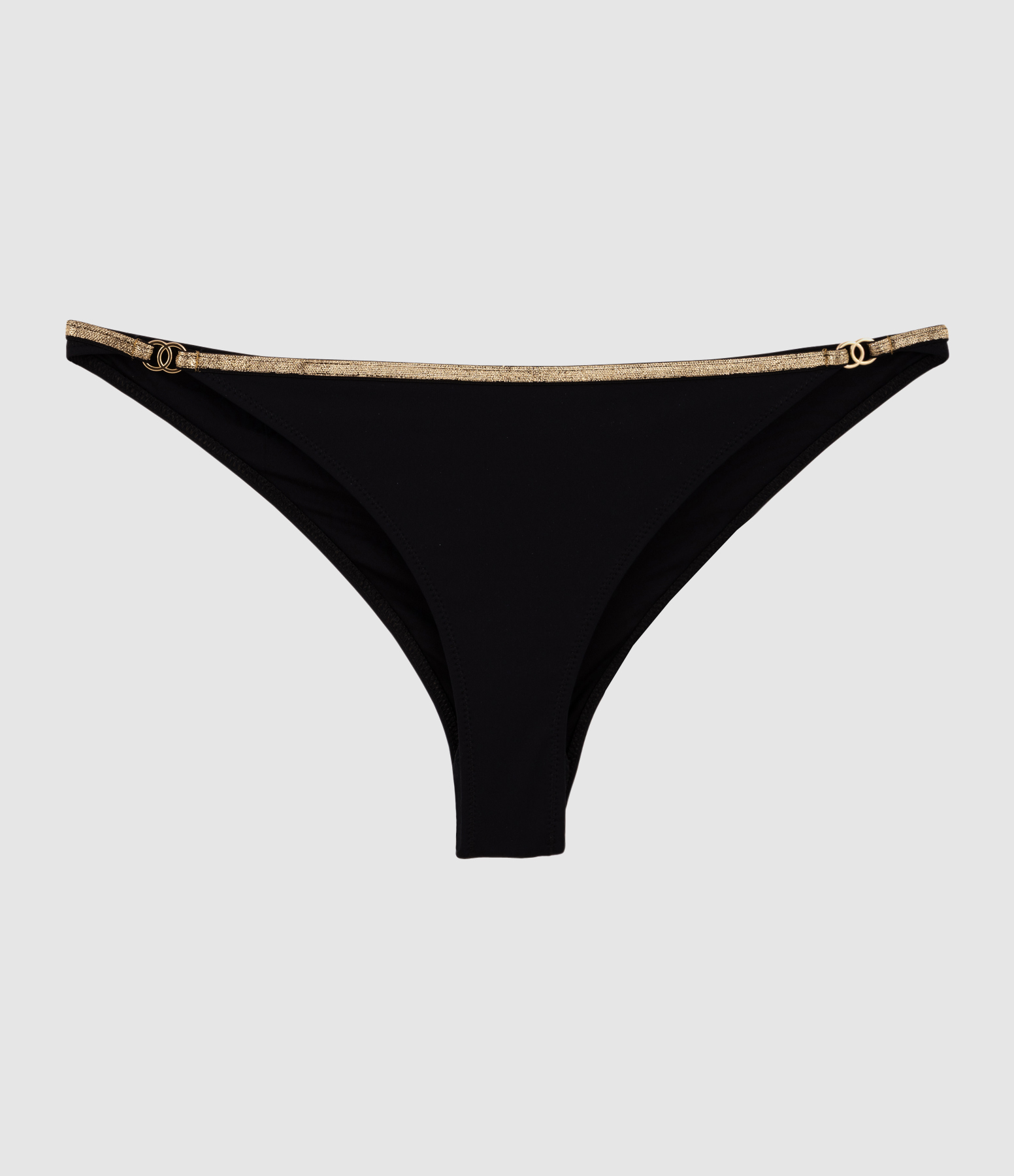 Bas de maillot de bain tanga noire. Échancré sur l'arrière pour mettre en valeur les formes et fin sur les côtés pour un look féminin.