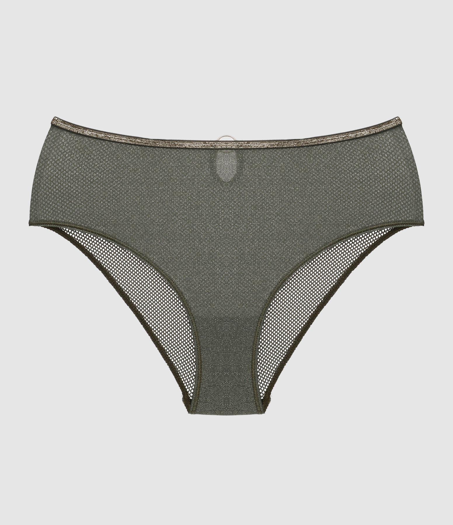 Culotte kaki à paillette et arrière en mesh avec liseré doré. Composé d'un anneau doré et d'une goutte dans le dos. Fond doublé.