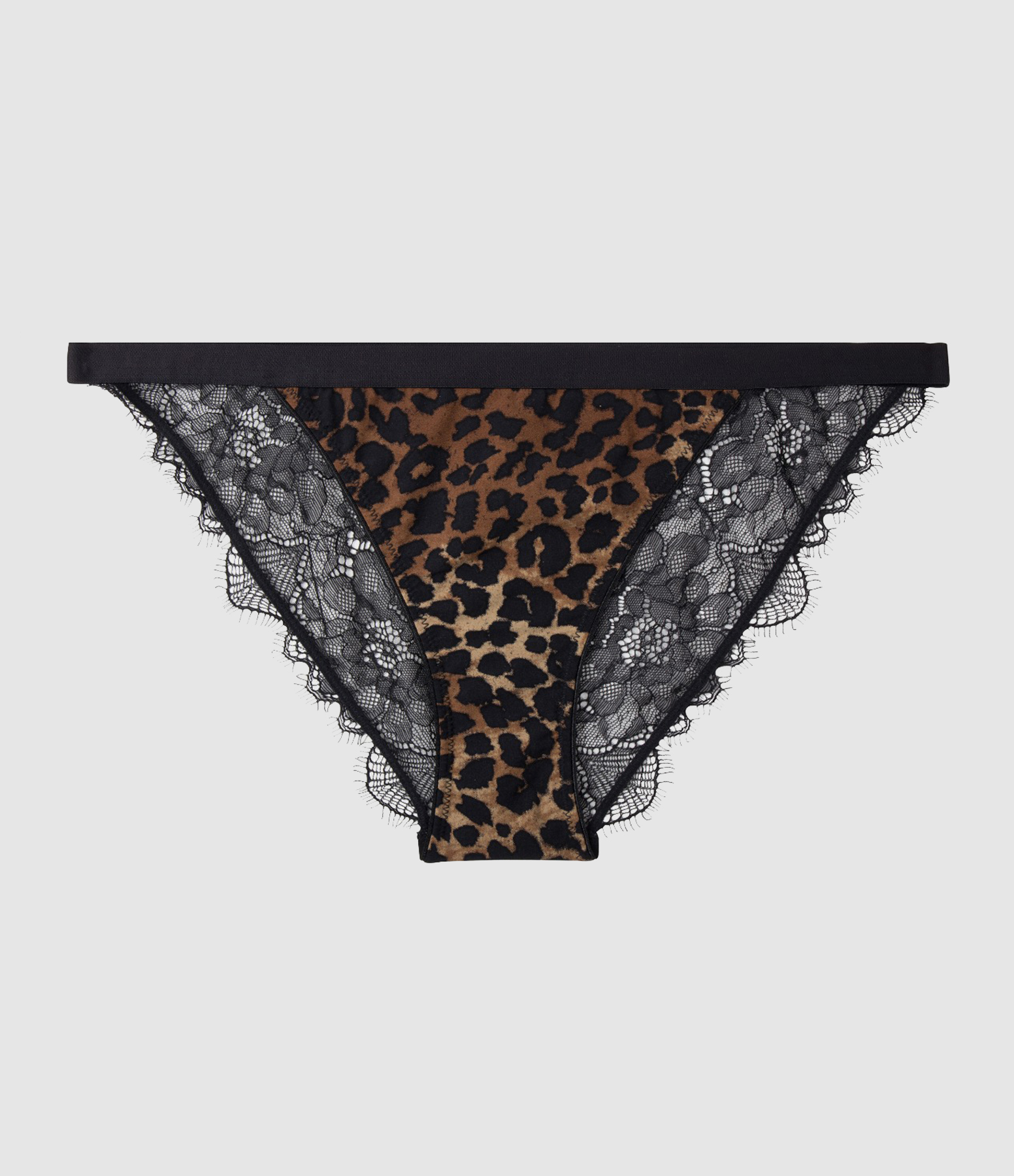 Culotte tanga en micro fibre à imprimé léopard à l'avant et dentelles florales noires à l'arrière. Finition par bordure festonnée en dentelle frangée. Bande élastiquée. Fond doublé en coton.