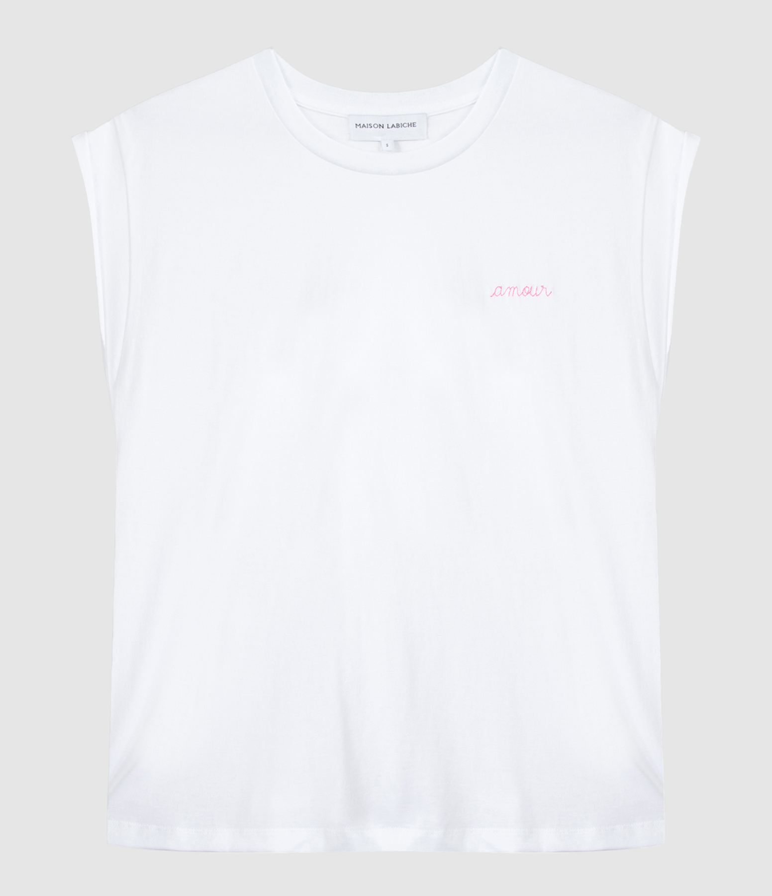 Débardeur en coton biologique blanc avec broderie rose "amour" côté cœur. Manches retroussées. Col rond. Coupe droite. Base droite.