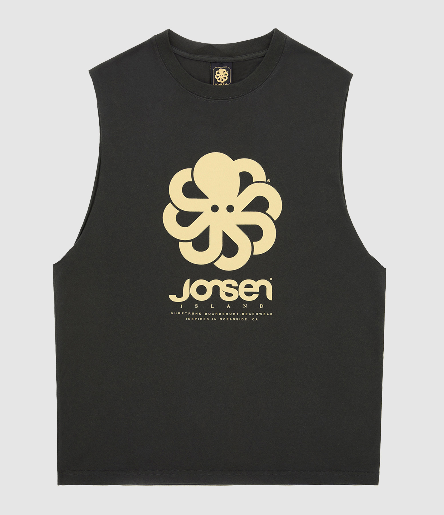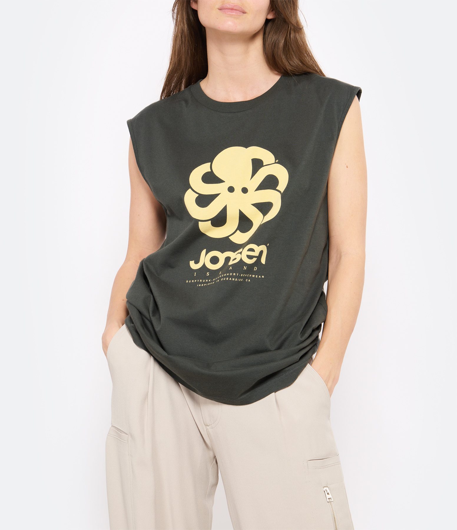 Débardeur sans manches en coton noir. Print et inscription à l'avant. Col rond côtelé. Coupe droite. Base droite.