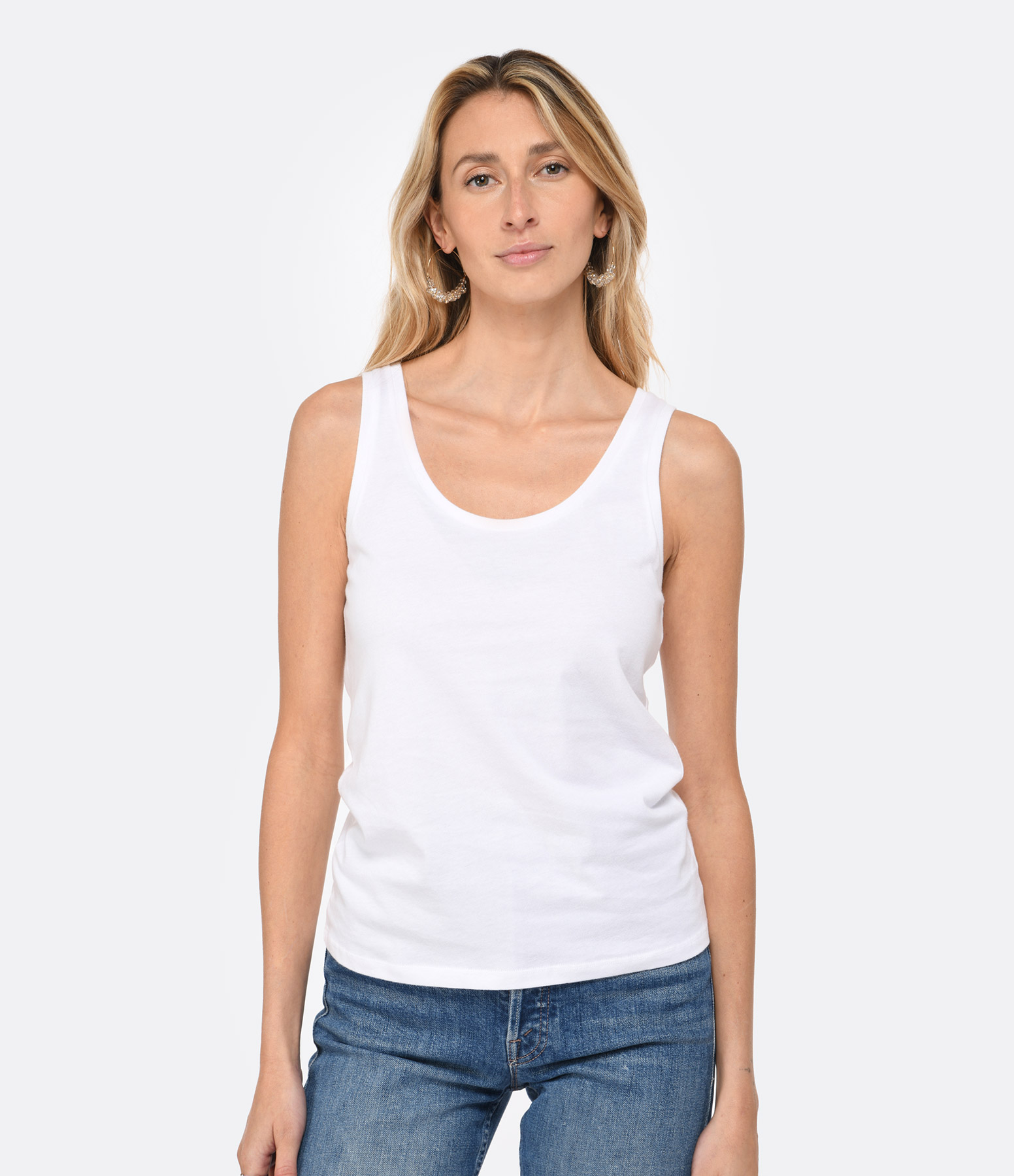 Débardeur en coton blanc. Col rond. Sans manches. Coupe droite. Base droite.