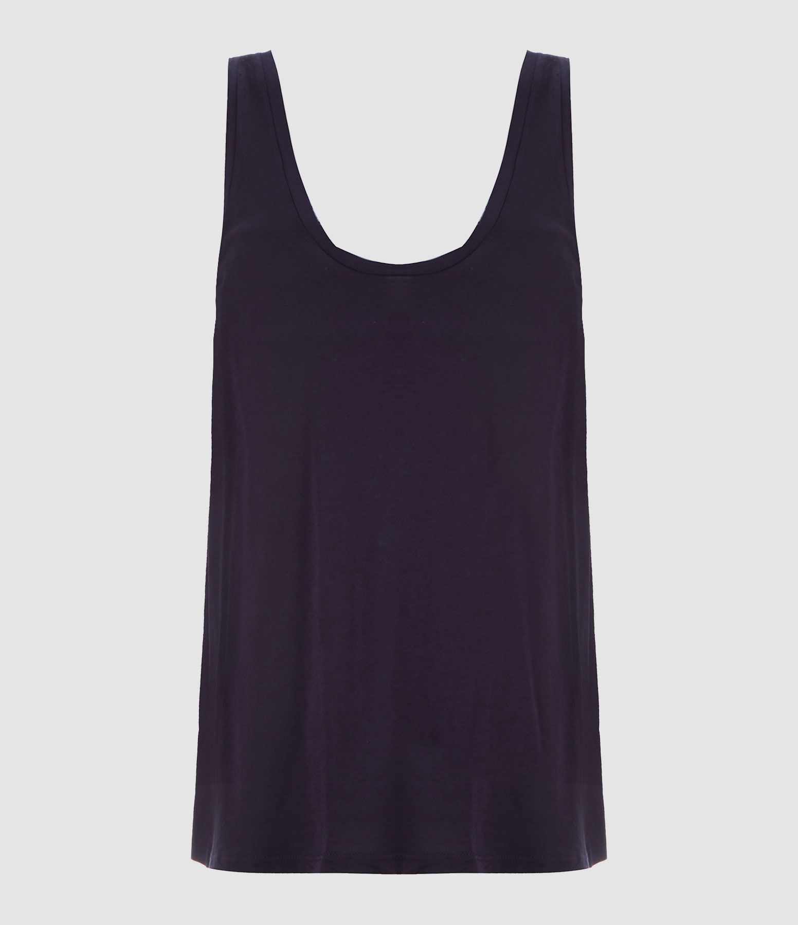 Débardeur en coton bleu marine. Col rond. Coupe droite. Base droite.