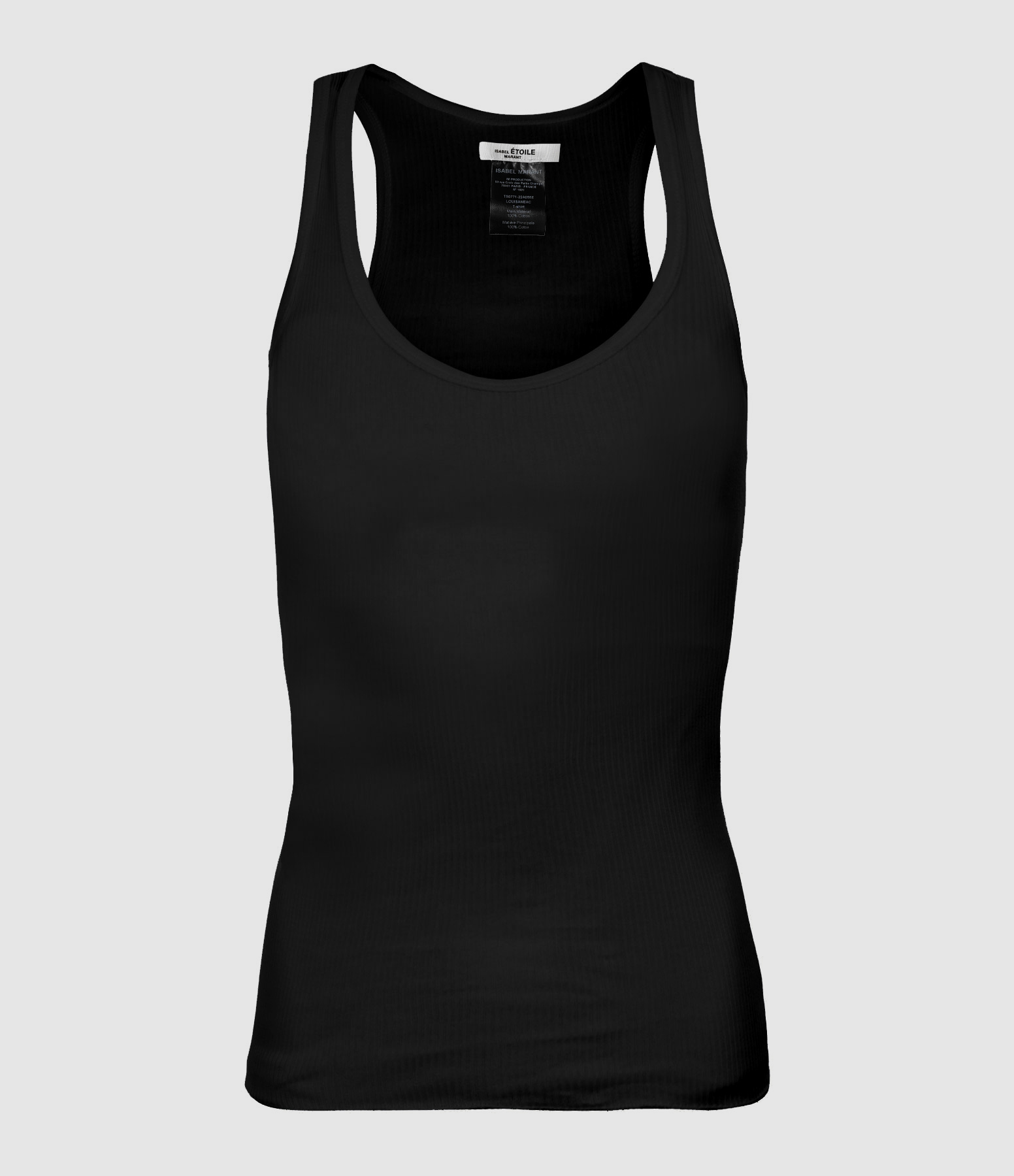Débardeur étroit extensible en coton noir. Col rond. Coupe droite et moulante. Base droite.