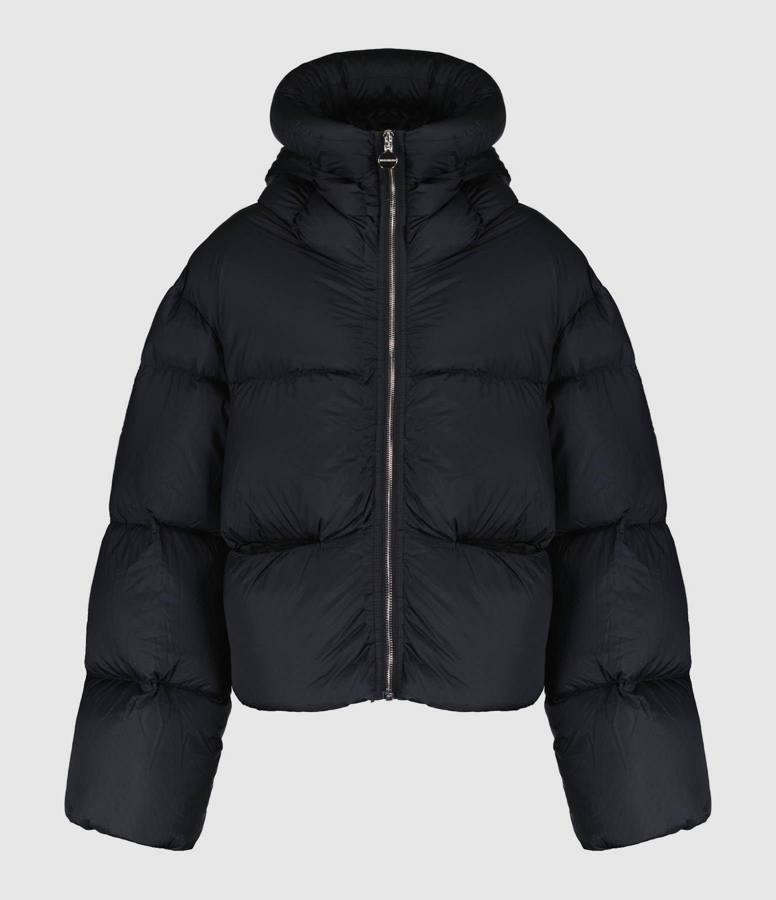 Veste doudoune matelassée noire. Col montant. Manches longues. Fermeture zippée sur le devant avec curseur gravé du logo. Deux poches passepoilées sur le devant. Coupe droite. Base droite avec cordon de serrage.