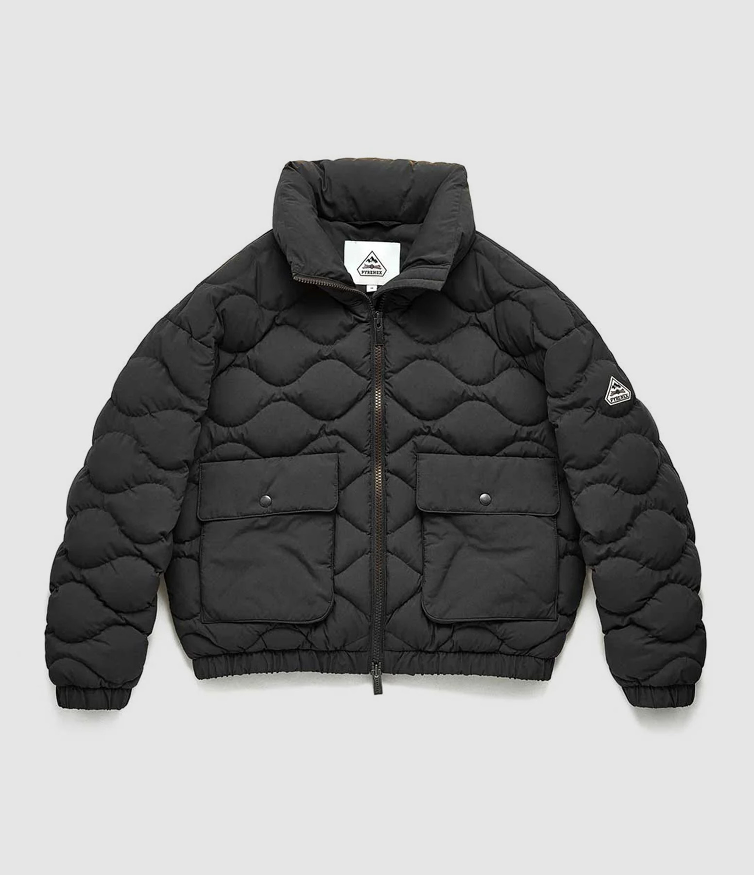 Doudoune matelassée noire mat, zip avec détail de la marque. Poches latérales plaquées à rabats. Col montant. Détail logo marque brodé sur la manche gauche. Manches longues.