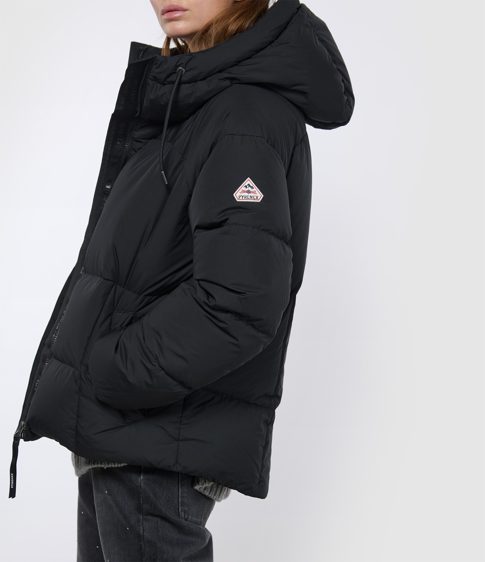 Doudoune matelassée noire matte, zip dissimulé avec détail de la marque. Poches latérales en biais avec zip dissimulé. Col montant. Détail logo marque brodé sur la manche gauche. Manches longues. Capuches à cordon de serrage.