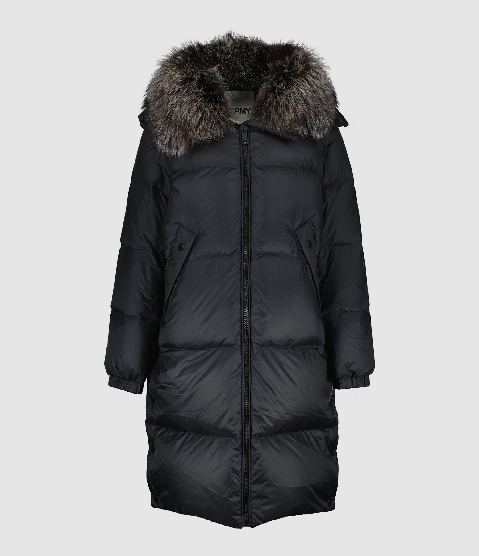 Veste doudoune matelassée longue en tissu technique noir. Col montant en fourrure avec capuche amovible par boutons pression. Manches longues amovibles par fermeture zippée. Patch noir estampillé "YS ARMY" cousu sur la manche gauche. Fermeture zippée sur le devant. Deux poches raglans pressionnées sur le devant. Fentes latérales pressionnées. Coupe droite. Cordon de serrage intérieur pour une coupe plus ajustée.Base droite.