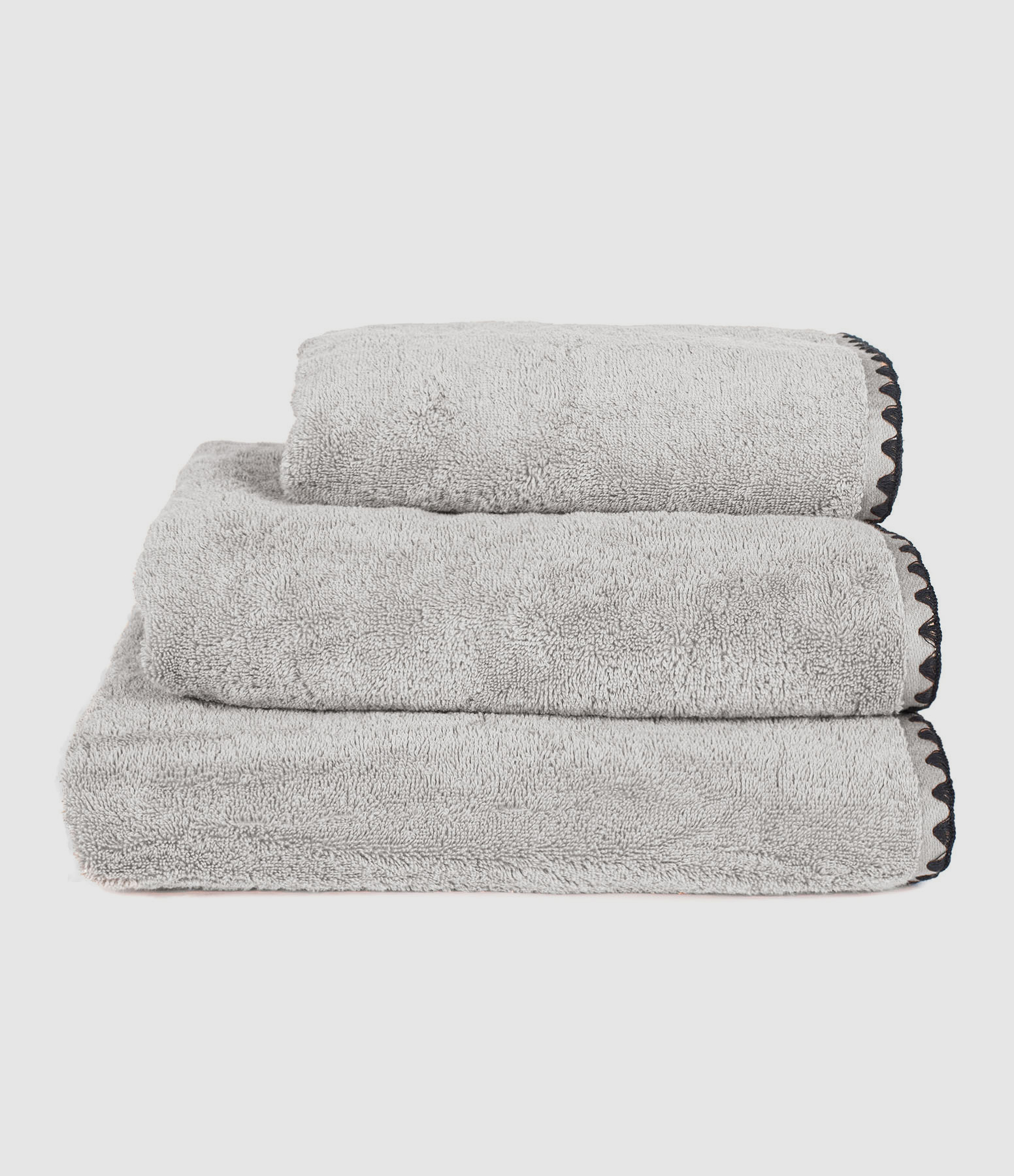 Drap de bain en coton gris 550 g/m2 avec finition crochet noir.