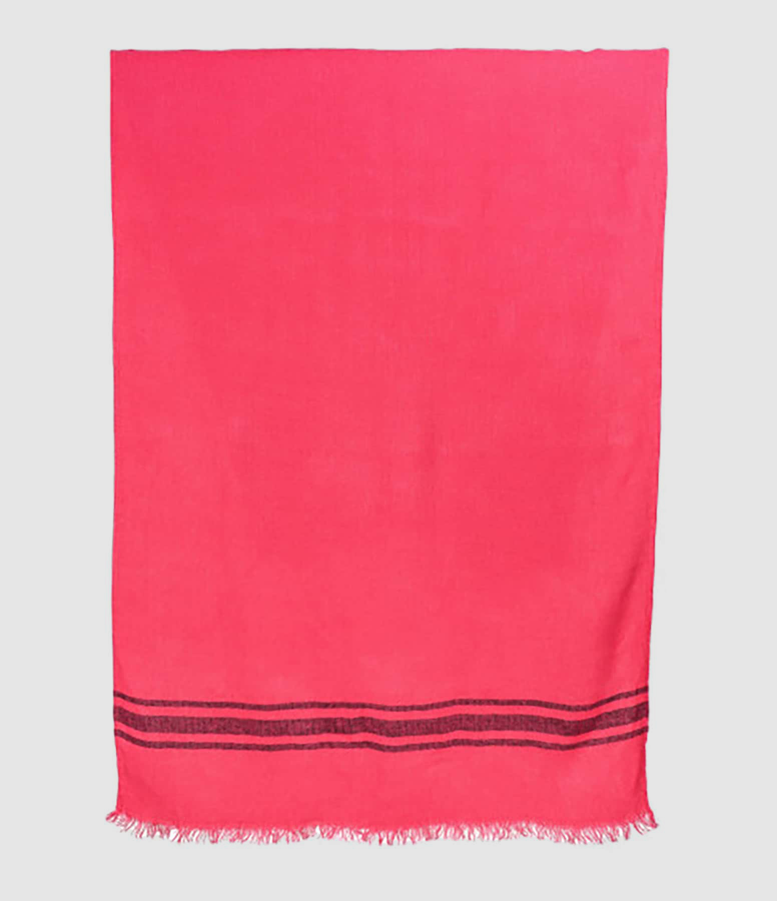 Drap de bain en coton framboise. Bandes noires. Bords frangés.